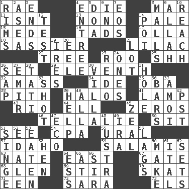 ACROSS 1. Actress Charlotte 4. Singer Brickell 8. Impair 11. Is not 13. Words to Nanette 14. Light colored 15. Ancient Persian 16. Bits 17. Rounded earthenware pot or jar 18. More disrespectful 21. Pale purple color 22. Relationship diagram 23. Friend of Pooh 25. Quiet! 26. Put into a specified state 29. Veterans Day date 32. Collect or gather 34. Binary compound 35. Chief or king in Benin or Nigeria 38. Essential or central part 39. Auras 41. Desk light 43. River (Sp.) 44. Pipe bend 45. Nothings 46. Copy Pinocchio 50. Be seated 51. Perceive with the eye 54. Accounting whiz (abbr.) 55. Mountain range 57. Potato state 59. Deli grouping 63. Nathan's nickname 64. Compass direction 67. Yard entry 68. Small, secluded valley 69. Use a swizzle stick 70. Three-handed card game 71. Car or cant ending 72. "Two Mules for Sister ____" 73. Raised railways DOWN 1. Basketball hoops 2. Toward the sea 3. Conclusions 4. Main course 5. ___ good deed 6. Working for oneself (abbr.) 7. Greek goddess of the dawn 8. Promenades 9. Assad's deity 10. Arrive at 12. Trial 14. Luau course 19. Angers 20. Snakelike fish 21. Car dealer's back yard 23. Redecorate 24. Washington bills 26. Plant excrement 27. Arab leader 28. Jacques of French films 30. Country estate 31. Opening into or through something 33. Went for two points 36. Long, evenly shaped pieces 37. Mine, in Marseilles 39. Aid 40. Silent film actress Nazimova 42. Pacific Standard Time (abbr.) 45. Ardor 47. Environmental prefix 48. A period of five years 49. Lyricist Gershwin 51. Burn superficially 52. Peak District village in England 53. Eroded 56. Fails to keep up a pace 58. Layer 60. Create 61. Slanted text style (abbr.) 62. Arranges properly for use 64. Curvy letter 65. _ moment's notice (2 wds.) 66. Title for a knight