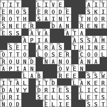 ACROSS 1. Teat (slang) 4. Moving, as bait 8. Small island 11. Greek god of love 13. Wear away 15. What Jean-Claude Killy likes to do 16. Writer of Portnoy's Complaint (1969) 17. Inhabitant of Heaven 18. Son of Odin 19. Scornful expression 21. Daniel's nick name 22. French philosopher Descartes 23. Curvy letter 24. Actress Gardner 27. "One Day ___ Time" 29. Capital of Western Samoa 30. Indian state 34. Put into a specified state 36. Caspian sea tributary 39. One or ones belonging to thee 40. Von Bismarck 41. Failure 43. Calm and collected 44. Single shot of ammunition 46. Billionth: prefix 47. Santa ___, CA 48. Bee-related 49. Baking chamber 51. Experiment locale 53. To riddle 54. Compass dir. 57. Slanted text style (abbr.) 60. It would 63. Member of a famous L.A. basketball team 65. _ Jones' Locker 66. Frees from moisture 69. Louse (plural) 70. RI univ. 71. Exchanges for money 72. Allows 73. Dreamland 74. Writer Wiesel 75. Fast jet (abbr.) DOWN 1. Laconic 2. Removes the wrinkles 3. Hauls 4. French article 5. Lyricist Gershwin 6. Null 7. Pulitzer Prize-winning author Ferber 8. American tennis player Robert 9. Picture 10. Hoop that covers a wheel 12. A female animal or person 14. Inactive volcano in Sicily 18. File 13 20. Hit sharply and swiftly 25. Small bottle 26. Composer Copland 28. Make lace 29. Without tonality 31. The Jewish people; Israel 32. Small Philippine buffalo 33. Cartoonist voice _ Blanc 34. Cease 35. Needle case 37. White ___ sheet 38. Sir (Sp.) 40. Mouth or opening 42. Be footloose 45. Heredity factor (abbr.) 50. Snakelike fish 52. Auction offers 54. Atmospheres 55. Religious groups 56. Obtain by seizing forcibly or violently 57. Goddess of spring and wife of Bragi 58. Edible starchy tuberous root 59. Enthusiastic 61. Woody plant 62. Deli pickle 64. Everything 67. Connecticut Ivy Leaguer 68. Compass dir.