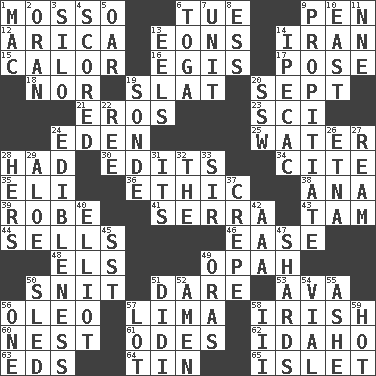 ACROSS 1. With motion or animation 6. Third day of the wk. 9. Fenced enclosure 12. N. Chile seaport 13. Immeasurably long periods of time 14. SW Asia republic 15. Bodily heat indicating an inflammation 16. The front part of a cuirass 17. Airs 18. Or not 19. Narrow board 20. Back-to-school mo. 21. Greek god of love 23. _-fi 24. Paradise 25. Wetness 28. Possessed 30. Proofreads 34. Quote 35. Connecticut Ivy Leaguer 36. Value system 38. Santa ___, CA 39. Loose flowing garment 41. Spanish missionary in California 43. Scottish cap 44. Makes a sale 46. Comfort 48. Raised railways 49. Brightly colored fish 50. In a ____ (agitated or irritated) 51. Have the gumption 53. Actress Gardner 56. Margarine 57. Pale green bean 58. From or relating to Ireland 60. Egg locale 61. Lyric poems 62. Potato state 63. Begley and Asner 64. Shallow baking pan 65. Small island DOWN 1. Big _ 2. NW Algerian seaport 3. Grain storage tower 4. Tallied 5. Rowing implement 6. Ancient Roman robe 7. A single undivided whole 8. Curvy letter 9. Conciliate 10. 90 degrees 11. Compass dir. 13. Snakelike fish 14. Medicinal drug used to evoke vomiting 19. Something which is sent 20. Compass dir. 22. To riddle 24. The property of being fit to eat 26. Inactive volcano in Sicily 27. 480, 500 or 516 sheets of paper 28. Possessive pronoun 29. Medicinal plant 31. ___ a Wonderful Life 32. Definite Article 33. Title for a knight 37. Streamer paper 40. American author Paul (1891-1958) 42. American Automobile Association (abbr.) 45. Fast jet (abbr.) 47. Pottery fragments 49. Mouths or openings 50. Downhill vehicle 51. "You Light Up My Life" star Conn 52. So be it 54. Small bottle 55. American tennis player Robert 56. Single 57. Car dealer's back yard 58. One more than two 59. Being at a high temperature