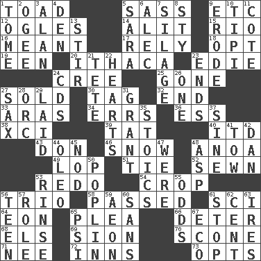 ACROSS 1. Frog relative 5. Backtalk 9. And so on (abbr.) 12. Stares at amorously 14. Set down 15. River (Sp.) 16. Intended 17. Have trust in 18. Choose 19. Car or cant ending 20. New York city 23. Singer Brickell 24. Algonquian 25. Went 27. Exchanged or delivered for money 30. Label 32. Conclusion 33. Caspian sea tributary 34. Blunders 36. Double-curved letter 38. One more than ninety 39. Make lace 40. It would 43. Spanish title 46. Overwhelm 48. Small Philippine buffalo 49. Trim (branches) 51. Standoff 52. Stitched 53. Make new 54. Riding implement 56. Musical group of three 58. Went by 61. _-fi 64. Age 65. Entreaty 66. Prevent from occurring 68. Raised railways 69. The Jewish people; Israel 70. Biscuitlike quick bread 71. Born 72. Taverns 73. Elects DOWN 1. Heavy book 2. Double curve, resembling the letter S 3. ____ Jay Lerner 4. Lair 5. "Two Mules for Sister ____" 6. Actor Baldwin 7. Fodder prepared in a silo 8. Filthy place 9. Eat (away) 10. Native american tent (variation) 11. ____ d'Azur (French Riviera) 13. Commotion 21. False hair 22. Centers of feelings and intuitions 23. Conclusions 24. Music discs 26. Single 27. Saxophone 28. The grampus (Milton) 29. Put down 31. Monetary aid 35. Unemotional ones 37. Trig term 41. Pull behind 42. One of the 12 tribes of Israel 44. Butter sub 45. Lower and raise head in agreement 47. Past tense of be (plural) 48. Cleo's killer 50. Cotton for raincoats, e.g. 53. Wash lightly 55. Likelihood 56. Adolescent 57. Hero or heavy, e.g. 59. A really long time 60. Without 61. Constrict 62. Penny 63. Angers 65. Air pressure measure (abbr.) 67. Environmental prefix