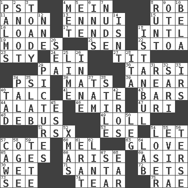 ACROSS 1. Pacific Standard Time (abbr.) 4. Count _ (2 wds.) 8. Director Reiner 11. Soon (poet.) 13. World-weariness 15. Shoshoni 16. Grant temporary use of 17. Is inclined (to) 18. International (abbr.) 19. Methods 21. Elected rep. 22. Portico 23. Filthy place 24. Biblical high priest 27. Teat (slang) 29. Ache 30. Tarsus (plural) 34. Air pressure measure (abbr.) 36. Floor protectors 39. Approach 40. Baby powder 41. Maternal 43. Taverns 44. Having winglike extensions 46. Arab leader 47. RI univ. 48. To get out of a bus 49. Hang loosely or laxly 51. Acura sports coupe 53. Compass dir. 54. Allow 57. ____ d'Azur (French Riviera) 60. Cartoonist voice _ Blanc 63. Michael Jackson trademark 65. Ripens 66. Originate 69. SW Saudi Arabia district 70. Soggy 71. Before Barbara or Clara 72. Antes 73. Perceive with the eye 74. Pull into pieces 75. Actress Charlotte DOWN 1. Insides of hands 2. Snob 3. Sycophant 4. Was introduced to 5. Compass dir. 6. Lodging establishments 7. Naked 8. Undersized animal 9. Von Bismarck 10. Actor Lugosi 12. Compass dir. 14. Is not 18. Byzantium, centuries later 20. Ocean 25. Welles in "The Third Man" 26. Empty; void 28. Call ___ day 29. Photos 31. Located in or toward the back 32. Indian skirt 33. Big collection agency 34. Light colored 35. Broad, flat, thick piece 37. Scottish cap 38. Vertical member of a panel or frame 40. Bit 42. Greek god of love 45. Double-curved letter 50. Part of a journey 52. Dec. holiday 54. Failure 55. Webber/Rice musical 56. Laconic 57. Crow sounds 58. Double curve, resembling the letter S 59. Wig 61. Part of Q.E.F. 62. Actor's bit 64. Experiment locale 67. R.R. building 68. Hearing organ