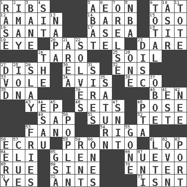 ACROSS 1. Teases 5. Period of immesurable duration 9. Make lace 12. At full speed 14. Sharp remark 15. Bear (Spanish) 16. Before Barbara or Clara 17. At sea 18. Teat (slang) 19. Sight organ 20. Soft color 23. Have the gumption 24. Edible starchy tuberous root 25. Earth 27. Food container 30. Raised railways 32. Followers of ems 33. Short-tailed, large-bodied rat 34. Opinion 36. Environmental prefix 38. Heredity factor (abbr.) 39. Period 40. Benjamin's nick name 43. Slangy assent 46. Puts into a specified state 48. Airs 49. Plant excrement 51. Player for Phoenix 52. False hair 53. Papal veil 54. Port city in Latvia 56. Shade of tan 58. Right away 61. Chop off 64. Biblical high priest 65. Small, secluded valley 66. New (sp.) 68. Regret 69. Trig term 70. Keyboard key 71. Consenting reply 72. Pismires 73. Is not DOWN 1. To erase 2. "If ____ say so..." 3. Object of repulsion 4. Be seated 5. Blind as ____ 6. Relaxation 7. Threatening words 8. Basketball assoc. 9. "_____ Recall" 10. SW Saudi Arabia district 11. Carry 13. California wine valley 21. Type of rug 22. Finds the solution 23. Flat circle 24. Definite Article 26. Single 27. Movie disc 28. Electrically charged atom 29. Kill 31. Male parents of animals 35. Titan orbits this 37. Mitch Miller's instrument 41. Eastern Standard Time (abbr.) 42. Born 44. Son of Isaac 45. Baking dish 47. In a ____ (agitated or irritated) 48. Parent Teacher Assoc. 50. Cotton for raincoats, e.g. 53. Strips of potato fried in deep fat 55. Went 56. Suggestive of the supernatural 57. A slight indication 59. Monthly bill 60. Washington bills 61. Allows 62. Baking chamber 63. Left side of a ship or aircraft 65. Girls' org. (abbr.) 67. University (slang)