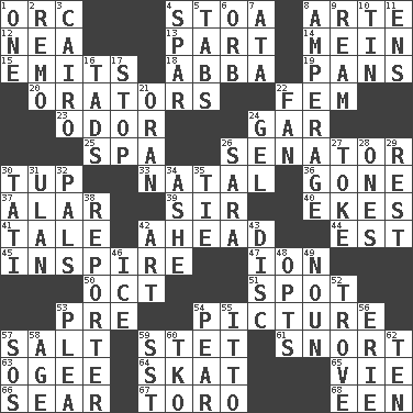 ACROSS 1. The grampus (Milton) 4. Portico 8. Johnson of "Laugh-In" 12. Teachers' org. 13. Component 14. Chow _ 15. Sends forth 18. Swedish rock group 19. Baking dishes 20. Speakers 22. Opposite of masc. 23. Aroma 24. Slender fish 25. Health resort 26. Elected representative 30. Uncastrated adult male sheep 33. Relating to or accompanying birth 36. Went 37. Having or resembling wings 39. Title for a knight 40. Supplements with great effort 41. Lie 42. Having the leading position 44. Eastern Standard Time (abbr.) 45. Motivate 47. Electrically charged atom 50. Sep. follower 51. Blemish 53. Before (prefix) 54. Photo 57. Table seasoning 59. Proofreading order 61. Derisive sound 63. Double curve, resembling the letter S 64. Three-handed card game 65. Compete 66. Dry up 67. "Corrida" creature 68. Car or cant ending DOWN 1. Single 2. San ____ (Riviera town) 3. Capital of Egypt 4. Coast Guard woman 5. Bar bills 6. Globe 7. _ moment's notice (2 wds.) 8. Electrical Measurement 9. 480, 500 or 516 sheets of paper 10. Shallow baking pan 11. Followers of ems 16. Small boys 17. Constrict 21. NW Algerian seaport 22. Air blower 24. Set 26. "Two Mules for Sister ____" 27. Puff or smoke 28. Washington bills 29. Take ten 30. Jacques of French films 31. Uhlan (variant) 32. Friends 34. American tennis player Robert 35. Standoff 38. Newsperson 42. Tate display 43. Plate 46. Frozen water 48. Elects 49. Part of speech 52. Collection of objects 53. Entreaty 54. Lightbulb-shaped fruit 55. "Tell ____ the Marines!" 56. One of the Great Lakes 57. Mayday 58. Mature 59. Fast jet (abbr.) 60. Ring climax 62. Nine, plus one