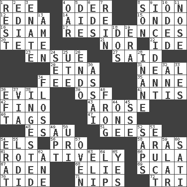 ACROSS 1. To separate or throw off 4. Baltic tributary 8. The Jewish people; Israel 12. Pulitzer Prize-winning author Ferber 14. Assistant 15. Southwest Nigerian state 16. Thailand, formerly 17. Dwellings 20. False hair 21. And not 22. Binary compound 23. Take place subsequently 27. Alleged 29. Inactive volcano in Sicily 31. Actress Patricia 34. Gives food to 35. Singer Murray 36. Tending to cause great harm 39. Order of Saint Francis (abbr.) 41. Nuclear Threat Initiatives 42. Fine (Spanish) 43. Came up 46. Labels 47. Charged particles 48. Son of Isaac 51. Honkers 54. Raised railways 56. Adept person 58. Ancient river in northeast Turkey 61. Rotating or pertaining to rotation 66. Monetary unit of Botswana 67. An important port of Yemen 68. Writer Wiesel 69. Go away! 70. Periodic rise and fall of the sea level 71. Cuts off 72. Three (prefix) DOWN 1. Remainder 2. Singer Brickell 3. Related on the mother's side 4. Boat paddle 5. Pass on 6. Begley and Asner 7. It's straight from the horse's mouth 8. Male child 9. Event 10. Wrote a lyric poem 11. Olfactory organ 13. So be it 18. Two (Sp.) 19. Epoch 24. Perceive with the eye 25. Shoshoni 26. Inside; within (prefix) 28. Silly 30. Slender Brazilian palm 32. Black tropical American cuckoo 33. French article 34. Soft thread for cleaning between teeth 36. Lizard (obsolete) 37. By way of 38. Consumed 40. Tree-dwelling hopper 44. Single 45. Compass dir. 49. Fitting 50. RI univ. 52. Plant excrements 53. Spew [out] 54. Part of Q.E.F. 55. Farming town in central California 57. Baking chamber 59. Having or resembling wings 60. Suttee (variant) 62. One (Scot) 63. Biblical high priest 64. Mouth edge 65. It is so