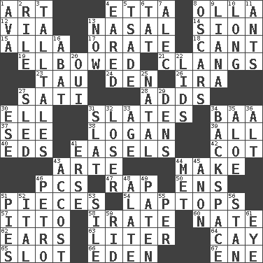 ACROSS 1. Tate display 4. Singer James 8. Water jar 12. By way of 13. Rhinal 14. The Jewish people; Israel 15. Silent film actress Nazimova 17. Speak pompously 18. Patter 19. Turned at an angle; bent 21. Gives out a loud, resonant sound 23. The 19th letter of the Greek alphabet 24. Lair 26. Retirement account (abbr.) 27. Suttee (variant) 28. Does sums 30. Pipe bend 31. Chalkboards 34. Sound made by sheep 37. Perceive with the eye 38. Utah city north of Ogden 39. Everything 40. Begley and Asner 41. Artist's stands 42. Small bed 43. Johnson of "Laugh-In" 44. Cause to be 46. Personal Computers (abbr.) 47. Strike 50. Followers of ems 51. Components 54. Portable computers 57. "Tell ____ the Marines!" 58. Feeling or showing extreme anger 60. Nathan's nickname 62. Hearing organs 63. 61 cubic inches 64. Island 65. Notch 66. Paradise 67. Compass dir. DOWN 1. Actress Gardner 2. Cause heat under the collar 3. Baron Munchausen's specialties 4. Having ears or earlike features 5. Sadhe (variant) 6. Make lace 7. Actor Baldwin 8. Motion picture awards 9. Climbing, woody, usually tropical vines 10. Yearn 11. Pismires 13. Immediately 16. Blind as ____ 20. Fr. "Yes" 22. Hats (slang) 25. Brizilian seaport 27. Downhill vehicle 29. Cub Scout units 30. Compass dir. 31. Narrow board 32. Failure 33. Ripen 34. Keyboard key 35. _ vera 36. The first octave above the treble staff 41. Celtic language 43. Buttonhole 44. Was introduced to 45. Soon (poet.) 46. Stone: prefix 48. Having winglike extensions 49. Eucharist need 51. Sliced desserts 52. Slanted text style (abbr.) 53. Drop; flow; fall 55. For each 56. Comedian Laurel of Laurel & Hardy 59. To free from 61. Sight organ
