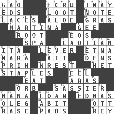 ACROSS 1. E Mali city 4. Shade of tan 8. "If ____ say so..." 12. Begley and Asner 13. Spoils 14. Musical sound 15. Shoestrings 18. Medicinal plant 19. Pate de foie ____ 20. Chrissie's court nemesis 22. Unit of force equal to gravity 23. Carrot, for example 24. Greek goddess of the dawn 25. Health resort 26. Of or relating to Laos or its people 30. Call ___ day 33. Crowbar 36. Inactive volcano in Sicily 37. Hindu Mythology: god of death 39. Small island 40. Cub Scout units 41. Demure 42. Take or capture by force 44. Was introduced to 45. Paper fasteners 47. Snakelike fish 50. Consume 51. Ancient river in northeast Turkey 53. Globe 54. More disrespectful 57. Nanny 59. Grant temporary use of 61. Ferber et al. 63. Cassini of fashion 64. "This won't hurt ____!" 65. Baseball player Mel 66. Raze (variant) 67. Writing tablets 68. Marina Del _, California DOWN 1. Set 2. First of billions? 3. Witty Wilde 4. Flair 5. Root beer relative 6. Friend of Pooh 7. Shoshoni 8. Swallowed 9. Greater amount 10. "One Day ___ Time" 11. It is so 16. Greek god of love 17. Close up, plug up 21. Slanted text style (abbr.) 22. Thick or sticky substance 24. Ewer handle 26. Allows 27. A distinct part 28. Singer Murray 29. Political cartoonist Thomas 30. Naughty children 31. Small pie 32. Roberta Peters solo 34. Hearing organs 35. Compete 38. Electrical Measurement 42. Soggy 43. Beverages made from leaves 46. Experiment locale 48. Celtic language 49. Put down 52. Sir (Sp.) 53. Singles 54. Expressed in words 55. Pismires 56. Assign a rank or rating to 57. And not 58. Insect wing 59. Infant locale 60. Chief or king in Benin or Nigeria 62. Filthy place