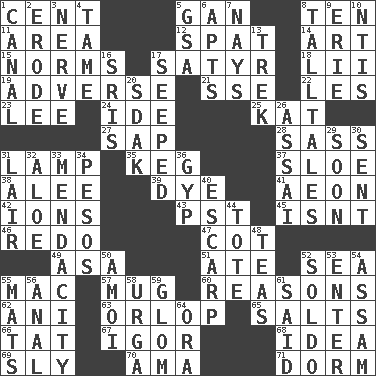 ACROSS 1. Penny 5. Separate the seeds from cotton 8. Nine, plus one 11. Length times width 12. Argument over a trivial matter 14. Tate display 15. Typical models 17. Man with strong sexual desires 18. Cards in a Roman deck? 19. Contrary to your interests or welfare 21. Compass dir. 22. French article 23. Area sheltered from the wind 24. Binary compound 25. Krazy ___ of comics 27. Plant excrement 28. Backtalk 31. Desk light 35. Cask 37. A type of plum 38. Toward shelter 39. Color 41. Period of immesurable duration 42. Charged particles 43. Pacific Standard Time (abbr.) 45. Is not 46. Do over again 47. Small bed 49. White ___ sheet 51. Had dinner 52. Ocean 55. Big _ 57. Java container 60. Thinks logically 62. Black tropical American cuckoo 63. Fourth or lowest deck 65. Table seasonings 66. Make lace 67. Russian composer Stravinsky 68. The content of cognition 69. Stealthy 70. Housemaid (var.) 71. Dormintory (informal) DOWN 1. Lessep's creation 2. Wear away 3. Boldness 4. Docile 5. Girls' org. (abbr.) 6. Flats, for short 7. Negative votes 8. Baron Munchausen's specialties 9. One of the Great Lakes 10. Nuclear Threat Initiatives 13. Long journey 16. Indian titles of respect 17. Oozed 20. Neighbor of Neb. 26. Slender Brazilian palm 29. Within a short period 30. Emitted 31. Den 32. _ vera 33. Ananias' fault 34. Mexican monetary units 36. Hustle 40. Fortification 44. Carry 48. Afternoon social gatherings 50. Mine, in Marseilles 52. Twentieth part of a lira 53. Keyboard key 54. Indian state 55. Floor coverings 56. Of or related to the anus 58. Capital and largest city of Mongolia 59. Seize upon or latch onto something 61. Stated 64. Mouth or opening