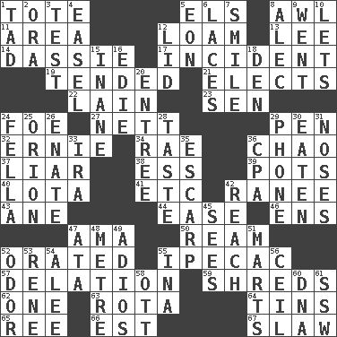 ACROSS 1. Carry 5. Raised railways 8. Leather borer 11. Type of rug 12. Rich soil 13. Area sheltered from the wind 14. Small ungulate mammals of Africa 17. Event 19. Watched over 21. Chooses 22. (Had) reclined 23. Elected rep. 24. Enemy 27. Remaining after all deductions 29. Writing instrument 32. Bert's buddy 34. Actress Charlotte 36. US Secretary of Labor Elaine L. _ 37. One who doesn't tell the truth 38. Double-curved letter 39. Plant holders 40. Globular water bottle used in Asia 41. And so on (abbr.) 42. The wife of a rajah (variant) 43. One (Scot) 44. Relaxation 46. Followers of ems 47. Wet nurse (var.) 50. 480, 500 or 516 sheets of paper 52. Declaimed 55. Medicinal drug used to evoke vomiting 57. Accusation by an informer 59. Fragments 62. Single 63. Round or rotation of duties 64. Canisters 65. To sift 66. Eastern Standard Time (abbr.) 67. Cole _ (cabbage dish) DOWN 1. Small boy 2. Mouth or opening 3. Trial 4. Artist's stand 5. A really long time 6. Shoestrings 7. Grin 8. Actor Baldwin 9. Left 10. Allows 12. Hat (slang) 15. Lacking in sense or substance 16. Singer Brickell 18. Lair 20. Main course 24. Chap (slang) 25. Constellation of myth 26. Maternal 28. Clothes sense 29. Give a jingle 30. Ingested 31. Olfactory organs 33. Lyricist Gershwin 35. Fortification 36. Tax preparer (abbr.) 42. Arrive at 45. Observes 47. "One Day ___ Time" 48. Distance measurement (Brit.) 49. Goodbye (Sp.) 51. Shops 52. Aroma 53. French philosopher Descartes 54. Toward shelter 55. _ tizzy (2 wds.) 56. To provide with a ceiling 58. Baseball player Mel 60. Heredity factor (abbr.) 61. Compass dir.