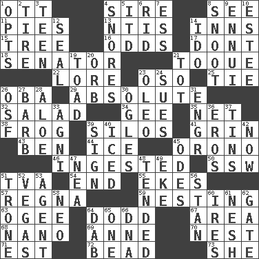 ACROSS 1. Baseball player Mel 4. Title for a man of rank and authority 8. Observe 11. Sliced desserts 13. Nuclear Threat Initiatives 14. Lodging establishments 15. Relationship diagram 16. Likelihood 17. Do not 18. Elected representative 21. Woman's close-fitting hat 22. Old wives' tales, e.g. 23. Bear (Spanish) 25. Standoff 26. Chief or king in Benin or Nigeria 29. Utter; complete 32. First course 34. Turn to the right 35. Fish or hair follower 38. Toadlike animal 39. Grain storage towers 41. Smile widely 43. Benjamin's nick name 44. Frozen water 45. U. of Maine site 46. Swallowed 50. Compass dir. 51. Federal power corp. 54. Conclusion 55. Supplements with great effort 57. Canadian anthropologist Darnell 59. Snuggling 63. Double curve, resembling the letter S 64. Texas town _ City 67. Type of rug 68. Billionth: prefix 69. Queen of England 1702-14 70. A home for chicks 71. Eastern Standard Time (abbr.) 72. Necklace unit 73. A female animal or person DOWN 1. Elects 2. Become fatigued 3. Adolescent 4. Sounds asleep 5. It would 6. To free from 7. Double-curved letter 8. Snout, nose 9. World-weariness 10. First name in cosmetics 12. Lick closed 14. Wedding promise 19. Frog relative 20. Globe 21. Small child 23. Margarine 24. Takes to court 26. Order of Saint Francis (abbr.) 27. Sharp remark 28. Medicinal plant 30. Stares at amorously 31. Engineer (abbr.) 33. Hindu god of fire 36. Greek god of love 37. Airtight sealed metal containers 39. Omen 40. On the rocks 42. At this time 45. Lyric poems 47. Teachers' org. 48. Looked after 49. Make supply last 51. Marketplace scale 52. Viva Las _ 53. Representative 56. Comedian Laurel of Laurel & Hardy 58. Modern: prefix 60. Angers 61. Soft 62. Yard entry 64. Apply (a substance) by light strokes 65. Single 66. Heredity factor (abbr.)
