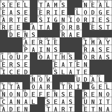 ACROSS 1. Stitch closed the eyes of (a falcon) 5. Scottish caps 9. Actress Patricia 13. Relaxation 14. One of the Great Lakes 15. Cabin 16. Johnson of "Laugh-In" 17. Seigniories (variant) 19. To separate or throw off 20. "One Day ___ Time" 21. Globe 22. Eastern Standard Time (abbr.) 23. Cub Scout units 25. Actress Charlotte 26. Nest on high 30. "If ____ say so..." 34. Aches 35. To erase 36. Central Nebraska county 39. Profane or obscene expressions 42. Mouths or openings 43. Celtic language 44. Ingested 46. On the rocks 47. Chalkboard 48. At this time 51. Allodial 54. Call ___ day 57. Boat paddle 58. Three (prefix) 60. Set 62. Unrelated to defense, as in spending 65. Western Nevada city 66. Lessep's creation 67. Oceans 68. A single undivided whole 69. Arabian gulf 70. Small pie 71. Inactive volcano in Sicily DOWN 1. Wither 2. Having ears or earlike features 3. First name in cosmetics 4. Area sheltered from the wind 5. Trial 6. Roberta Peters solo 7. Russian fighter aircraft 8. Sir (Sp.) 9. Not either 10. Singer Brickell 11. Grows older 12. For fear that 15. Ear part 18. Lyricist Gershwin 20. Toward the sea 24. Slept 27. River (Sp.) 28. _ tizzy (2 wds.) 29. _____ Park, CO 30. Pressed 31. Spoil 32. White ___ sheet 33. It is so 36. Flowery wreath 37. The grampus (Milton) 38. Purpose 40. Actor Linden 41. R.R. building 45. Needle case 48. Christmas carol 49. Clumsy lout 50. Obtain by seizing forcibly or violently 52. Rep 53. Soviet premier 1918-24 54. South American Indian 55. Frog relative 56. Singer Murray 58. Russian ruler of old 59. Take ten 61. Globular water bottle used in Asia 63. One of the 12 tribes of Israel 64. Teachers' org. 65. Regret