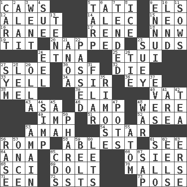 ACROSS 1. Crow sounds 5. Jacques of French films 9. Raised railways 12. Native American of Southwest Alaska 14. Actor Baldwin 15. Modern: prefix 16. The wife of a rajah (variant) 17. French philosopher Descartes 18. Compass dir. 19. Teat (slang) 20. Slept 23. Beer foam 24. Inactive volcano in Sicily 25. Needle holder 27. A type of plum 30. Order of Saint Francis (abbr.) 32. Pass on 33. Shout 34. SW Saudi Arabia district 36. Sight organ 38. Cartoonist voice _ Blanc 39. Connecticut Ivy Leaguer 40. Large container 43. White ___ sheet 46. Moist 48. Past tense of be (plural) 49. Mischievous child 51. Friend of Pooh 52. Toward the sea 53. Nursemaid 54. Play the lead 56. Play 58. Most capable 61. Perceive with the eye 64. Santa ___, CA 65. Algonquian 66. Flexible twig of a willow tree 68. _-fi 69. Dunce 70. Promenades 71. Car or cant ending 72. Fast planes 73. Introduce or present, as a question DOWN 1. Haul 2. Jai ____ 3. Left 4. Institute legal proceedings 5. Canvas cover 6. Toward shelter 7. Watched over 8. Frozen water 9. World-weariness 10. Grant temporary use of 11. Sty mamas 13. Portable shelter 21. Small Philippine buffalo 22. Went by 23. Chop _ 24. Snakelike fish 26. Neckwear 27. Symbol (abbr.) 28. Area sheltered from the wind 29. Rounded earthenware pot or jar 31. Having threads 35. Full of chinks, cracks, or crevices 37. Nights before holidays 41. "We ___ not amused" (Victoria) 42. Beverage made from leaves 44. Simple or foolish person 45. Housemaid (var.) 47. Plant holders 48. Armed conflict 50. N Egypt peninsula 53. At full speed 55. Tiny particle 56. To erase 57. At one time in the past 59. Waist strap 60. Allows 61. Grain storage tower 62. Snakelike fish 63. Celtic language 65. Music discs 67. Plant excrement