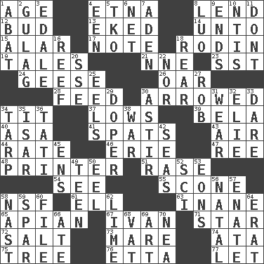 ACROSS 1. Personal question 4. Inactive volcano in Sicily 8. Grant temporary use of 12. Partially opened flower 13. Supplemented with great effort 14. To (old English) 15. Having or resembling wings 17. Brief written record 18. "The Thinker" sculptor 19. Falsehoods 21. Compass dir. 23. Fast jet (abbr.) 24. Honkers 26. Rowing implement 28. Nourish 30. Moved like an arrow 34. Teat (slang) 37. Moos 39. Actor Lugosi 40. White ___ sheet 41. Arguments over trivial matters 43. Wind 44. Assign a rank or rating to 46. One of the Great Lakes 47. To riddle 48. Hard copy producer 51. To erase 54. Perceive with the eye 55. Biscuitlike quick bread 58. Overdraft (abbr.) 61. Pipe bend 63. Lacking in sense or substance 65. Bee-related 67. "Terrible" tsar 71. Play the lead 72. Table seasoning 73. Female horse 74. "One Day ___ Time" 75. Woody plant 76. Singer James 77. Allow DOWN 1. Blind as ____ 2. Russian prison camp 3. Peak District village in England 4. Car or cant ending 5. Ring climax 6. Fish or hair follower 7. An important port of Yemen 8. Nilotic language 9. Extremities 10. Nuclear Threat Initiatives 11. Do not 16. Coral ridge 18. Hitchcock's "____ Window" 20. Compass dir. 22. And not 25. Snakelike fish 27. Director Reiner 29. Drug addict 30. Moving about 31. Erode 32. Writer Wiesel 33. Have the gumption 34. Canvas cover 35. Austrian river, tributary to the Danube 36. Jacques of French films 38. Armed conflict 42. Oceans 45. Followers of ems 49. Adolescent 50. Snakelike fish 52. _-fi 53. Immeasurably long periods of time 56. Relating to or accompanying birth 57. Related on the mother's side 58. Political cartoonist Thomas 59. Coast Guard woman 60. Do some clerical work 62. Welles in "The Third Man" 64. Part of Q.E.F. 66. Had dinner 68. Large container 69. Nonscientific branch of learning 70. Teachers' org.