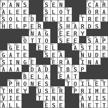 ACROSS 1. Zero-star reviews 5. Elected rep. 8. 4-wheeled motor vehicle 11. Toward shelter 12. Narrow opening 14. Mouth or opening 15. Having a sole or soles 17. Writer Wiesel 18. Relationship diagram 19. Aide 21. Broken pieces 23. Tired old horse 25. Suggestive of the supernatural 26. "Beetle Bailey" pooch 27. Perceive with the eye 28. Plant excrement 31. Set 33. Snakelike fish 35. Being in motion 37. Yard entry 38. Ocean 40. Unadorned 41. Burn superficially 43. Epoch 45. _ tizzy (2 wds.) 46. Auto club (abbr.) 47. June honoree 50. Cook's measure (abbr.) 52. Actor Lugosi 53. Erode 54. Gives a jingle 56. Bathroom plumbing fixture 61. Those people 62. One who uses or employs something 65. First class 66. Compete 67. Prong on a fork 68. Opinion 69. 100% 70. Compass dir. 71. Remaining after all deductions DOWN 1. Romantic infatuation 2. Medicinal plant 3. 1994 drama film starring Jodie Foster 4. Ooze 5. Compass dir. 6. Pipe bend 7. Annoying sounds 8. Drawstring 9. Ancient Greek god of war 10. Actress Charlotte 13. Giggle 16. Gouge 18. Attempt 20. Pace 22. Length times width 24. Leaves 26. Cassini of fashion 28. Astound 29. Opera by Verdi 30. Before (prefix) 31. Greek goddess of the earth (variant) 32. Inactive volcano in Sicily 34. Area sheltered from the wind 36. Sever or remove by pinching or nipping 37. Girls' org. (abbr.) 39. Johnson of "Laugh-In" 42. Locale of original sin 44. Blind as ____ 48. Eskimo relative 49. Small ungulate mammals of Africa 51. Close up, plug up 52. Male child 54. Silvers or Donahue 55. Person who is morally reprehensible 57. SW Asia republic 58. Not recorded 59. Send forth 60. Trial 61. Federal power corp. 63. Followers of ems 64. Portuguese money of account (variant)