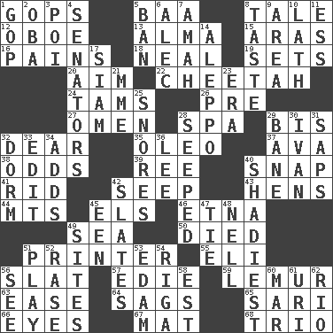 ACROSS 1. Republicans 5. Sound made by sheep 8. Story 12. Mitch Miller's instrument 13. _ mater 15. Ancient river in northeast Turkey 16. Aches 18. Be tempered by heat 19. Puts into a specified state 20. Direct toward a target or goal 22. Leopard's kin 24. Scottish caps 26. Before (prefix) 27. Sign of things to come 28. Health resort 29. Altar cloth linen 32. Letter starter 35. Butter sub 37. Actress Gardner 38. Likelihood 39. To sift 40. Fastener 41. To free from 42. Ooze 43. Coop moms 44. Mountains (abbr.) 45. Raised railways 46. Inactive volcano in Sicily 49. Ocean 50. Passed on 51. Hard copy producer 55. Biblical high priest 56. Narrow board 57. Singer Brickell 59. Arboreal primate 63. Comfort 64. Settles 65. Indian skirt 66. Sight organs 67. Floor protector 68. Musical group of three DOWN 1. Grand Old Party 2. Chief or king in Benin or Nigeria 3. Luau course 4. Elected representatives 5. Prohibit 6. Actor Baldwin 7. Wet nurse 8. Clothes sense 9. Length times width 10. Thin strip of wood or metal 11. Double-curved letter 14. City in Syria 17. Thailand, formerly 21. Madame (abbr.) 23. Epoch 25. Sounds asleep 28. Oozed 29. Object of repulsion 30. _ the terrible 31. Plant excrements 32. Dormintory (informal) 33. Prepare for publication 34. Sums up 36. Area sheltered from the wind 40. Most dubious of character or honesty 42. Chalkboards 45. Car or cant ending 47. Make a knot 48. 1994 drama film starring Jodie Foster 49. Locates 51. Live dramatic performance 52. Raze (variant) 53. Dutch treat 54. Capital of Latvia 56. Perceive with the eye 58. Eastern Standard Time (abbr.) 60. Third mo. 61. RI univ. 62. River (Sp.)