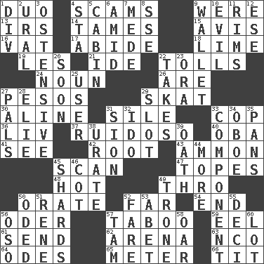 ACROSS 1. Superhero pair 4. Fraudulent business schemes 9. Past tense of be (plural) 13. Big collection agency 14. Makes less strong or intense 15. Deliberation 16. Large container 17. Stay 18. Welles in "The Third Man" 19. French article 21. Binary compound 22. For Whom the Bell _____ 24. Part of speech 26. "We ___ not amused" (Victoria) 27. Mexican monetary units 29. Three-handed card game 30. Place in a line 31. Drop; flow; fall 33. Police officer (slang) 36. 54 in ancient Rome 37. Boisterous (Brazilian Portuguese) 40. Chief or king in Benin or Nigeria 41. Perceive with the eye 42. Carrot, for example 43. ID or VA city 45. Examine minutely or intensely 47. Drinks excessively 48. Being at a high temperature 49. Through, poetically 50. Speak pompously 52. At a great distance 54. Conclusion 56. Baltic tributary 57. Off limits 59. Snakelike fish 61. Post 62. Sports stadium 63. Non-commissioned officer (abbr.) 64. Lyric poems 65. Distance measurement 66. Teat (slang) DOWN 1. HTML Container Element 2. Mountain range 3. Clearly or manifestly demonstrative 4. R.R. building 5. Small house or cottage 6. Among 7. Ancient Persian 8. Compass dir. 9. Place for singles 10. Morally bad or wrong 11. Basketball hoops 12. Compass dir. 20. Within a short period 22. Receives possession of 23. Mouth or opening 25. One who uses or employs something 27. Friends 28. Writer Wiesel 29. Groove 31. The Jewish people; Israel 32. Wedding promise 33. Part 34. Mitch Miller's instrument 35. Zero-star reviews 38. A salt of uric acid 39. Pledge 44. Greater amount 45. Pottery fragments 46. Small bed 49. Heavy duty weighing machine 50. Wrote a lyric poem 51. French philosopher Descartes 52. Conductor's collection 53. Collude with 55. Tenth: prefix 56. Bear (Spanish) 57. Scottish cap 58. Rowing implement 60. Car dealer's back yard