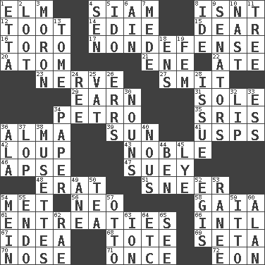 ACROSS 1. Shade tree 4. Thailand, formerly 8. Is not 12. A blast of a horn 14. Singer Brickell 15. Letter starter 16. "Corrida" creature 17. Unrelated to defense, as in spending 20. Tiny particle 21. Compass dir. 22. Had dinner 23. Effrontery 27. Stricken, poetically 29. Merit 31. Not divided or shared with others 34. Stone: prefix 35. Indian titles of respect 36. _ mater 39. Player for Phoenix 41. United States Postal Service (abbr.) 42. Central Nebraska county 43. Impressive in appearance 46. Domed church section 47. Chop _ 48. Part of Q.E.F. 51. Scornful expression 54. Was introduced to 56. Modern: prefix 58. Greek goddess of the earth (variant) 61. Pleas 66. International (abbr.) 67. The main thing one is thinking about 68. Haul 69. Stalk of a moss capsule 70. Characteristic smell of wine 71. At one time in the past 72. Period of immesurable duration DOWN 1. Singer James 2. Spoils 3. Person of subnormal intelligence 4. Elected rep. 5. Wedding promise 6. The 18th letter of the Arabic alphabet 7. Ancient Persian 8. Binary compound 9. Elected representatives 10. Political cartoonist Thomas 11. Relationship diagram 13. Heavy book 18. Followers of ems 19. Opposite of masc. 24. To sift 25. Large container 26. Blunders 28. Come out of 30. Parts of speech 32. Mouth edge 33. Double-curved letter 34. Some stationery 36. Wing 37. Trim (branches) 38. French bagpipes 40. Good sense 44. Benjamin's nick name 45. Sodium hydroxide 49. One (Scot) 50. Afternoon social gathering 52. The front part of a cuirass 53. Indian princess (variant) 54. Count _ (2 wds.) 55. Inside; within (prefix) 57. Von Bismarck 59. "Tell ____ the Marines!" 60. ____ Jay Lerner 62. Actress Charlotte 63. Electrically charged atom 64. And so on (abbr.) 65. Observe