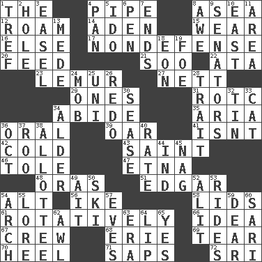 ACROSS 1. Definite Article 4. Corncob 8. Toward the sea 12. Wander 14. An important port of Yemen 15. Put on (as clothing) 16. Otherwise 17. Unrelated to defense, as in spending 20. Nourish 21. "Barney Miller" actor Jack 22. "One Day ___ Time" 23. Arboreal primate 27. Remaining after all deductions 29. Washington bills 31. College mil. group 34. Stay 35. Roberta Peters solo 36. Spoken 39. Boat paddle 41. Is not 42. Having a low temperature 43. Virtuous person 46. Lacquered or enameled metalware 47. Inactive volcano in Sicily 48. Mouths or openings 51. _ Allan Poe 54. Keyboard modifier key 56. D.D.E's nickname 58. Hats (slang) 61. Rotating or pertaining to rotation 66. The content of cognition 67. Group working together 68. One of the Great Lakes 69. Rend 70. The bottom of a shoe or boot 71. Plant excrements 72. Indian title of respect (Mr.) DOWN 1. Unclean, religiously 2. Hollow 3. Artist's stand 4. Baking dish 5. Wedding promise 6. Animal enclosure 7. Conclusions 8. Deep reverence 9. Legislators 10. 90 degrees 11. Length times width 13. Ancient Persian 18. A really long time 19. Enemy 24. Crowd into 25. Single; one (prefix) 26. Make new 28. Distinguishing feature 30. Gospel singer Marvin 32. Metal container 33. Feline 34. Tree or shrub in the Birch family 36. Sep. follower 37. Friend of Pooh 38. One to whom something is allotted 40. Pace 44. Indiana (abbr.) 45. Tired old horse 49. Small island 50. What Jean-Claude Killy likes to do 52. Came down and settled, as after flight 53. Amusement-park features 54. Bowlike part 55. Old wives' tales, e.g. 57. Nights before holidays 59. Letter starter 60. Indian skirt 62. Leather borer 63. Epoch 64. Mouth edge 65. It is so