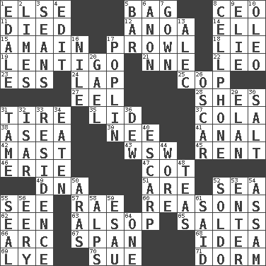 ACROSS 1. Otherwise 5. Container for groceries 8. Corporate head (abbr.) 11. Passed on 12. Small Philippine buffalo 14. Pipe bend 15. With great haste 17. Move like a hungry wolf 18. Untruth 19. Small, flat, pigmented spot on the skin 21. Compass dir. 22. Lion 23. Curvy letter 24. Infant locale 25. Police officer (slang) 27. Snakelike fish 28. "______ My Girl" (Turtles hit) 31. Become fatigued 35. Flaplike covering 37. Root beer relative 38. At sea 39. Born 41. Of or related to the anus 42. Vertical spar for supporting sails 43. Compass dir. 45. Monthly bill 46. 4th largest of the Great Lakes 47. Small bed 49. Heredity factor (abbr.) 51. "We ___ not amused" (Victoria) 52. Ocean 55. Observe 57. Actress Charlotte 60. Thinks logically 62. Car or cant ending 63. Columnist Joseph or Stewart 65. Table seasonings 66. Curve 67. Connect, as a bridge 68. The content of cognition 69. Potassium hydroxide 70. Institute legal proceedings 71. Dormintory (informal) DOWN 1. Peak District village in England 2. Citrus fruits 3. Actors Connery and Penn 4. Prepare for publication 5. Tavern 6. Soon (poet.) 7. Woman's formal wear 8. Portable communications device 9. Writer Wiesel 10. Butter sub 13. Actor Baldwin 16. The longest river in the world 17. Cotton for raincoats, e.g. 20. Highlander 26. Witty Wilde 29. Flair 30. Table seasoning 31. Not wild 32. Austrian river, tributary to the Danube 33. Home 34. Consumed 36. Morning condensation 40. Fortification 44. Had on 48. Beverages made from leaves 50. Ancient river in northeast Turkey 52. Twentieth part of a lira 53. Keyboard key 54. Indian state 55. Lick closed 56. Suggestive of the supernatural 58. High mountains 59. He sold his birthright 61. Expressed in words 64. Single