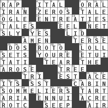 ACROSS 1. Reproach for some lapse or misdeed 4. Slanted text style (abbr.) 8. Taken by mouth 12. SW Asia republic 14. Nothings 16. Lie 17. Stare at amorously 18. Pleas 20. Falsehoods 22. Snakelike fish 23. Fish or hair follower 24. Playfully artful 25. It is so 28. Hat (slang) 30. So be it 31. Laconic 35. Two (Sp.) 37. Printing process, for short 40. Hang loosely or laxly 41. Arranges properly for use 42. You are 44. Needle holder 45. Jacques of French films 46. Separate forcefully 47. Definite Article 48. Came up 50. Woody plant 52. Three (prefix) 54. Eastern Standard Time (abbr.) 55. Adept person 58. It is 61. Fast jet (abbr.) 63. Small house or cottage 65. Wine waiters 70. Small pie 71. Roberta Peters solo 72. World-weariness 73. 1/640 square mile 74. College mil. group 75. Ooze 76. Atmosphere DOWN 1. Disturbances 2. Therefore, facetiously 3. Chummy 4. Ending with capital 5. "___ Little Indians" 6. Nonscientific branch of learning 7. Old wives' tales, e.g. 8. Baseball player Mel 9. Water falling in drops from the sky 10. Toward shelter 11. For fear that 13. Born 15. Stitch closed the eyes of (a falcon) 19. Set down 21. Symbol (abbr.) 26. Suggestive of the supernatural 27. Snob 29. Erase 30. Help 32. Writer of Portnoy's Complaint (1969) 33. Turn sharply 34. Connecticut Ivy Leaguer 35. Letter starter 36. "Beetle Bailey" pooch 38. Third day of the wk. 39. Declaim 41. R.R. building 43. Blunders 49. Celtic language 51. And so on (abbr.) 53. Small island 55. Phillipine bananalike plant 56. High-altitude cloud 57. Keyboard key 58. Austrian river, tributary to the Danube 59. "Corrida" creature 60. Stricken, poetically 62. Metal containers 64. "One Day ___ Time" 66. Apple computer (short form) 67. Compass dir. 68. Sorrow 69. Small drink
