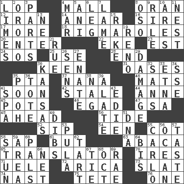 ACROSS 1. Chop off 4. Promenade 8. NW Algerian seaport 12. SW Asia republic 14. Approach 16. The founder of a family 17. Greater amount 18. Frustrating wastes of time 20. Keyboard key 22. Make supply last 23. Eastern Standard Time (abbr.) 24. Distress signal 25. Purpose 28. Conclude 30. Peachy ____! 31. Fertile tracts in a desert 35. Parent Teacher Assoc. 37. Nanny 40. Floor coverings 41. Within a short period 42. Showing deterioration from age 44. Queen of England 1702-14 45. Cooking vessels 46. Mild oath 47. Girls' org. (abbr.) 48. At or in the front 50. Periodic rise and fall of the sea level 52. Small drink 54. Car or cant ending 55. Small bed 58. Plant excrement 61. With the exception that 63. Phillipine bananalike plant 65. Interpreter 70. Angers 71. Ubangi River tributary 72. N. Chile seaport 73. Narrow board 74. Political cartoonist Thomas 75. False hair 76. Single DOWN 1. Citrus fruits 2. U. of Maine site 3. Pieces 4. Make imperfect 5. Cuckoo 6. Part of a journey 7. Unable to walk 8. Bear (Spanish) 9. Cause heat under the collar 10. Ancient Greek god of war 11. A home for chicks 13. Born 15. Libertine 19. Former U.S. Attorney General Janet 21. Regret 26. Elected reps. 27. Related on the mother's side 29. Break 30. Sunflower state 32. Without 33. Inactive volcano in Sicily 34. Compass dir. 35. "Silly old bear" 36. Carryall 38. Tired old horse 39. Having winglike extensions 41. Health resort 43. Singer Brickell 49. Claim 51. Heredity factor (abbr.) 53. Monetary unit of Botswana 55. Monte _, Las Vegas Hotel/Casino 56. Sea 57. Clothes sense 58. Make senseless or dizzy 59. Length times width 60. Friends 62. Small pie 64. Twice 66. Fish or hair follower 67. Standoff 68. Sep. follower 69. Actress Charlotte