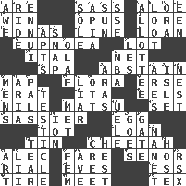 ACROSS 1. "We ___ not amused" (Victoria) 4. Backtalk 8. Medicinal plant 12. Victory 13. Musical composition 14. Old wives' tales, e.g. 15. Ferber et al. 18. Actor's bit 19. Grant temporary use of 20. Normal relaxed breathing 22. Car dealer's back yard 23. Slanted text style (abbr.) 24. Fish or hair follower 25. Health resort 26. Choose not to consume 30. Atlas unit 33. Plants 36. Celtic language 37. Part of Q.E.F. 39. Call ___ day 40. Snakelike fish 41. "Death on the ____" 42. Taiwanese island in East China Sea 44. Put into a specified state 45. More disrespectful 47. Oval reproductive body of a fowl 50. Small child 51. Rich soil 53. Metal container 54. Leopard's kin 57. Actor Baldwin 59. Conductor's collection 61. Sir (Sp.) 63. Monetary unit of Yemen 64. Nights before holidays 65. Double-curved letter 66. Become fatigued 67. Rendezvous 68. John Ritter's dad DOWN 1. Deep reverence 2. Travel on or in a vehicle 3. World-weariness 4. Flatfish 5. Capital of Western Samoa 6. Player for Phoenix 7. Compass dir. 8. One to whom something is allotted 9. Spoils 10. Mouth or opening 11. Car or cant ending 16. Flats, for short 17. Fastener 21. Norwegian king 22. French article 24. Basketball assoc. 26. Caspian sea tributary 27. Ancient Greek god of war 28. Capri or Wright 29. Egg locale 30. Not women's 31. Roberta Peters solo 32. Friends 34. One who doesn't tell the truth 35. Baseball player Mel 38. One of the two male reproductive glands 42. Was introduced to 43. Ubangi River tributary 46. Electrically charged atom 48. Travels 49. Yard entry 52. French painter Edouard 53. Lacerate 54. Algonquian 55. Command 56. Stockings 57. Tate display 58. Cards in a Roman deck? 59. Opposite of masc. 60. "___ Maria" 62. Acura sports coupe