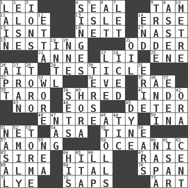 ACROSS 1. Flowery wreath 4. Lick closed 8. Scottish cap 11. _ vera 13. Small island 14. Celtic language 15. Is not 16. Remaining after all deductions 17. Political cartoonist Thomas 18. Nestling 21. More peculiar 22. Queen of England 1702-14 23. Cards in a Roman deck? 25. Compass dir. 26. Small island 29. One of the two male reproductive glands 32. Move like a hungry wolf 34. First lady 35. Actress Charlotte 38. Edible starchy tuberous root 39. Fragment 41. _ china 43. Not either 44. Greek goddess of the dawn 45. Prevent from occurring 46. Plea 50. _ tizzy (2 wds.) 51. Fish or hair follower 54. White ___ sheet 55. Prong on a fork 57. Amid 59. Pertaining to the sea 63. Father 64. Land elevation 67. Raze (variant) 68. _ mater 69. Slanted text style (abbr.) 70. Connect, as a bridge 71. Sodium hydroxide 72. Plant excrements 73. Tate display DOWN 1. (Had) reclined 2. Otherwise 3. Charged atoms 4. Burns superficially 5. Compass dir. 6. The first octave above the treble staff 7. Allow 8. Buy and sell 9. NE Netherlands city 10. Distance measurement (Brit.) 12. Singer James 14. Conclude 19. International (abbr.) 20. Compass dir. 21. Petroleum 23. Moving, as bait 24. On the rocks 26. Fitting 27. SW Asia republic 28. "Corrida" creature 30. Laconic 31. One of the Great Lakes 33. Had on 36. Against 37. Locale of original sin 39. Arranges properly for use 40. Israeli folk dance 42. Mouth or opening 45. Centimeter-gram-second unit of force 47. Tired old horse 48. Ringlike coral islands and reefs 49. Nervous spasm 51. Rhinal 52. Poet Dickinson 53. Singer Mel 56. Hearing organs 58. Teachers' org. 60. California wine valley 61. Austrian river, tributary to the Danube 62. Penny 64. Part of HMS, perhaps 65. Call ___ day 66. Infant locale