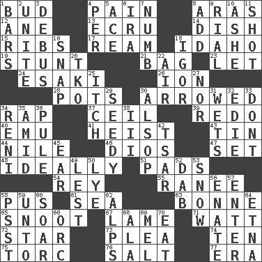 ACROSS 1. Partially opened flower 4. Ache 8. Ancient river in northeast Turkey 12. One (Scot) 13. Shade of tan 14. Food container 15. Teases 17. 480, 500 or 516 sheets of paper 18. Potato state 19. Difficult or unusual or dangerous feat 21. Paper or plastic container 23. Allow 24. 1973 Nobel Price Winner (Physics) Leo 26. Electrically charged atom 28. Cooking vessels 30. Moved like an arrow 34. Hit sharply and swiftly 37. To provide with a ceiling 39. Do over again 40. Australian flightless bird 41. Robbery 43. Shallow baking pan 44. "Death on the ____" 46. "Vaya con ____" 47. Arrange properly for use 48. Under perfect conditions 51. Groovy apts. 54. Marina Del _, California 55. Indian princess (variant) 58. Purulenc 61. Ocean 63. Maid-servant 65. Snout, nose 67. Unable to walk 71. Electrical Unit 72. Play the lead 73. Entreaty 74. Nine, plus one 75. Torque (variant) 76. Table seasoning 77. Period DOWN 1. Soap units 2. Join together 3. Alight from a bus 4. For each 5. Adept person 6. Retirement account (abbr.) 7. Unfeeling 8. Increase 9. Monetary unit of Yemen 10. American tennis player Robert 11. Attempt 16. Fastener 18. Russian composer Stravinsky 20. Ring climax 22. Wind 25. Hankering 27. And not 29. Shabby and untidy 30. Columnist Joseph or Stewart 31. Moistens 32. Singer Brickell 33. Do not 34. Painter Guido (1575-1642) 35. Among 36. Whine 38. One more than two 42. Russian ruler of old 45. Ewer handle 49. For fear that 50. Sodium hydroxide 52. Apply (a substance) by light strokes 53. Frozen precipitation 56. Maternal 57. Keyboard key 58. Inconspicuous attention getter 59. To (old English) 60. Fly high 62. High mountains 64. Inactive volcano in Sicily 66. The grampus (Milton) 68. Chicken ___ king 69. Cartoonist voice _ Blanc 70. Ingest