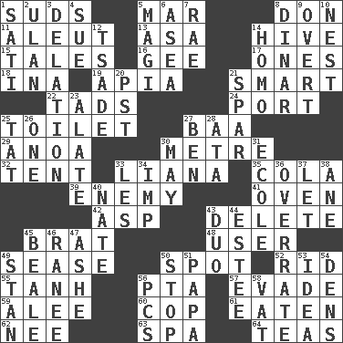 ACROSS 1. Beer foam 5. Spoil 8. Spanish title 11. Eskimo relative 13. White ___ sheet 14. Hub of activity 15. Lies 16. Unit of force equal to gravity 17. Singles 18. _ tizzy (2 wds.) 19. Capital of Western Samoa 21. Don Adams' spy role 22. Bits 24. Left side of a ship or aircraft 25. Bathroom 27. Sound made by sheep 29. Small Philippine buffalo 30. Distance measurement (Brit.) 32. Portable shelter 33. Climbing, woody, usually tropical vines 35. Root beer relative 39. Foe 41. Baking chamber 42. Cleo's killer 43. Erase 45. Naughty child 48. One who makes use of a thing 49. Gospel singer Marvin 50. Blemish 52. To free from 55. Hyperbolic tangent 56. Parent Teacher Association (abbr.) 57. Elude 59. Toward shelter 60. Police officer (slang) 61. Ingested 62. Born 63. Health resort 64. Afternoon social gatherings DOWN 1. Suttee (variant) 2. Uhlan (variant) 3. Accusation by an informer 4. Take to court 5. Wise men 6. Toward the sea 7. Actress Charlotte 8. Middle Eastern gold or silver currency 9. Unconcealed 10. A home for chicks 12. Sadhe (variant) 14. Like (prefix) 20. Pacific Standard Time (abbr.) 21. Practice fight 23. Having winglike extensions 25. Make lace 26. Single 27. Benjamin's nick name 28. _ moment's notice (2 wds.) 30. Can I? 31. Learning spot: Fr. 33. French article 34. Mischievous child 36. Make much ado about nothing 37. Allow 38. One (Scot) 40. Nathan's nickname 43. Superhero pair 44. First name in cosmetics 45. Memphis, Tenn. Street 46. Indian princess (variant) 47. American tennis player Robert 49. Comedian Laurel of Laurel & Hardy 50. Halt 51. Dad 53. The content of cognition 54. Habitations of wild animals 56. Personal Computers (abbr.) 58. Large container
