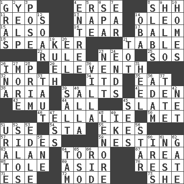 ACROSS 1. Flimflam 4. Celtic language 8. Quiet! 11. Vintage cars 13. California wine valley 14. Margarine 15. In addition 16. Pull apart 17. Lip ointment 18. Orator 21. Eating place 22. Court order 23. Modern: prefix 25. Mayday 26. Mischievous child 29. Veterans Day date 32. Compass direction 34. It would 35. Ingest 38. Roberta Peters solo 39. Table seasonings 41. Locale of original sin 43. Australian flightless bird 44. 100% 45. Schedule 46. Copy Pinocchio 50. Was introduced to 51. Purpose 54. R.R. building 55. Makes supply last 57. Amusement-park features 59. Nestling 63. Actor Alda or Thicke 64. "Corrida" creature 67. Length times width 68. Lacquered or enameled metalware 69. SW Saudi Arabia district 70. Repose 71. Compass dir. 72. Method 73. A female animal or person DOWN 1. Pate de foie ____ 2. Sharp bark 3. Airs 4. Main course 5. Actress Charlotte 6. Health resort 7. Ewer handle 8. Thick slices 9. Phone greeting 10. Dwellings 12. Fly high 14. Chief or king in Benin or Nigeria 19. Malaysian steamed pastry 20. Pipe bend 21. Small child 23. Remaining after all deductions 24. Extremities 26. _ tizzy (2 wds.) 27. Greater amount 28. Demure 30. Country residence 31. Person who is morally reprehensible 33. Tense 36. First of billions? 37. Wig 39. Table seasoning 40. Silent film actress Nazimova 42. Fish or hair follower 45. Perceives with the eye 47. Curvy letter 48. Poe poem 49. D.D.E's nickname 51. A salt of uric acid 52. Grain storage towers 53. Peak District village in England 56. Play the lead 58. Compass dir. 60. Angers 61. Delicate 62. Yard entry 64. Scottish cap 65. Bear (Spanish) 66. To free from
