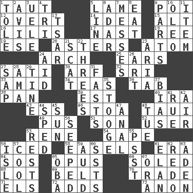 ACROSS 1. Tense 5. Unable to walk 9. Luau course 12. Unconcealed 14. The content of cognition 15. Keyboard modifier key 16. Ms. Damita and namesakes 17. Political cartoonist Thomas 18. To separate or throw off 19. Compass dir. 20. Michaelmas daisies 23. Tiny particle 24. Bowlike part 25. Hearing organs 27. Suttee (variant) 30. Sandy's bark 32. _ Lanka 33. Among 34. Afternoon social gatherings 36. Bar bill 38. Baking dish 39. Eastern Standard Time (abbr.) 40. Retirement account (abbr.) 43. Curvy letter 46. Portico 48. "Change" in Tahitian 49. Tenth month of the Hindu calendar 51. Boy, to dad 52. One who uses or employs something 53. French philosopher Descartes 54. Open wide 56. On the rocks 58. Artist's stands 61. Period 64. Mayday 65. Musical composition 66. Having a sole or soles 68. Car dealer's back yard 69. Waist strap 70. Buy and sell 71. Raised railways 72. Sums up 73. Soon (poet.) DOWN 1. Lacquered or enameled metalware 2. Advice 3. Ubangi River tributary 4. Three (prefix) 5. Actor's bit 6. The sixth month of the Jewish calendar 7. Makes clutter 8. Consume 9. Actors' quests 10. Margarine 11. A whole individual unit 13. Russian ruler of old 21. Go away! 22. Triplets 23. Roberta Peters solo 24. Assist 26. Nonscientific branch of learning 27. Plant excrement 28. Wet nurse (var.) 29. Prong on a fork 31. Goes without food and/or water 35. Moe Howard, for one 37. Prejudice 41. Sorrow 42. Atmosphere 44. Moved rapidly 45. Player for Phoenix 47. Of or related to the anus 48. Third day of the wk. 50. Oozed 53. Musical pauses 55. Inconspicuous attention getter 56. Capri or Wright 57. Calm and collected 59. Old (Scot.) 60. Fast planes 61. Style 62. Redecorate 63. Arabian gulf 65. Chief or king in Benin or Nigeria 67. Mouth or opening