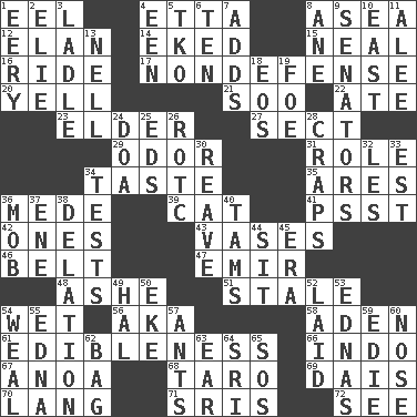 ACROSS 1. Snakelike fish 4. Singer James 8. At sea 12. Enthusiasm 14. Supplemented with great effort 15. Actress Patricia 16. Travel on or in a vehicle 17. Unrelated to defense, as in spending 20. Shout 21. "Barney Miller" actor Jack 22. Had dinner 23. A person who is older than you are 27. Religious group 29. Aroma 31. Hero or heavy, e.g. 34. Clothes sense 35. Ancient Greek god of war 36. Ancient Persian 39. Domesticated feline 41. Inconspicuous attention getter 42. Washington bills 43. Flower holders 46. Waist strap 47. Independent ruler or chieftain 48. American tennis player Robert 51. Lacking originality or spontaneity 54. Soggy 56. Alias (abbr.) 58. Arabian gulf 61. The property of being fit to eat 66. Southeast Asian peninsula 67. Small Philippine buffalo 68. Pacific island yam 69. Raised platform 70. Long (Scottish) 71. Indian titles of respect 72. Observe DOWN 1. Suggestive of the supernatural 2. Writer Wiesel 3. Dipping utensil 4. Car or cant ending 5. Ring climax 6. Nine, plus one 7. Sums up 8. A saturated hydrocarbon 9. Legislators 10. Compass direction 11. Toward shelter 13. 1994 drama film starring Jodie Foster 18. Greek goddess of the dawn 19. Enemy 24. ___ good deed 25. Begley and Asner 26. College mil. group 28. Dice game 30. Rob, plunder, or pillage 32. French article 33. Eastern Standard Time (abbr.) 34. Trials 36. Crowd into 37. Compass dir. 38. Accusation by an informer 40. Scottish caps 44. Be seated 45. Period 49. Actor Linden 50. Make supply last 52. Put down 53. Ferber et al. 54. Welt 55. Pulitzer Prize-winning author Ferber 57. Pismires 59. Singer Brickell 60. Sense of smell 62. Paper or plastic container 63. Hearing organ 64. _ Lanka 65. Distress signal