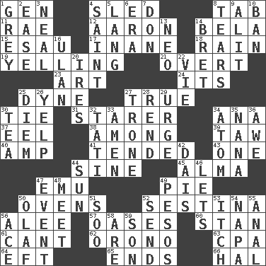 ACROSS 1. Commissioned mil. rank 4. Downhill vehicle 8. Keyboard key 11. Actress Charlotte 12. Composer Copland 14. Actor Lugosi 15. He sold his birthright 17. Empty; void 18. Water falling in drops from the sky 19. Crying or shouting loudly 21. Unconcealed 23. Tate display 24. It is 25. Centimeter-gram-second unit of force 27. Loyal 30. Neckwear 31. A viewer who gazes fixedly 34. Santa ___, CA 37. Snakelike fish 38. Amid 39. The 23rd letter of the Hebrew alphabet 40. Electrical Unit 41. Looked after 43. Single 44. Trig term 45. _ mater 47. Australian flightless bird 49. Sliced dessert 50. Baking chambers 52. French poetic form 56. Toward shelter 57. Fertile tracts in a desert 60. Comedian Laurel of Laurel & Hardy 61. Patter 62. U. of Maine site 63. Numbers guy (abbr.) 64. Newt 65. Extremities 66. Actor Linden DOWN 1. Jennifer or Joel 2. Comfort 3. Actress Patricia 4. Virtuous person 5. Austrian-born American filmmaker Fritz 6. Period 7. Spanish title 8. Lacerates 9. Set down 10. Bar 13. Modern: prefix 14. Cy Young winner Saberhagen 16. ____ Bator, Mongolia 20. Angers 22. Compete 25. South Vietnam president (1954) 26. Sharp bark 27. Heavy duty weighing machine 28. Tear apart 29. Goad 30. Beverage made from leaves 32. Jacques of French films 33. So be it 34. Smallest unit of an element 35. Grandmother 36. Deep reverence 42. Raised platform 44. Player for Phoenix 46. Allows 47. Incident 48. Confront 49. Mexican monetary units 50. Norwegian king 51. "Barney Miller" actor Jack 52. Post 53. Hankering 54. California wine valley 55. Of or related to the anus 56. Adept person 58. "We ___ not amused" (Victoria) 59. Boy, to dad