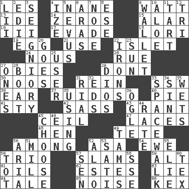 ACROSS 1. French article 4. Lacking in sense or substance 9. Electrical Unit 13. Binary compound 14. Nothings 15. Having or resembling wings 16. One more than two 17. Elude 18. Australian parrot (variant) 19. Oval reproductive body of a fowl 21. Purpose 22. Small island 24. Horse sense 26. Sorrow 27. Off-Broadway awards 29. Do not 30. Trap for birds or small mammals 31. It's straight from the horse's mouth 33. Compass dir. 36. Ewer handle 37. Boisterous (Brazilian Portuguese) 40. Sliced dessert 41. Filthy place 42. Backtalk 43. Let have 45. To provide with a ceiling 47. Shoestrings 48. Layer 49. False hair 50. Amid 52. White ___ sheet 54. She-sheep 56. Musical group of three 57. Shuts with force 59. Keyboard modifier key 61. Lubricates 62. _____ Park, CO 63. Untruth 64. Falsehood 65. Annoying sound 66. A weed DOWN 1. Cards in a Roman deck? 2. Singer Brickell 3. Signiory (variant) 4. Ending with capital 5. Mole, birthmark 6. Caspian sea tributary 7. Thickened enlargement 8. Compass dir. 9. Place for singles 10. Medicinal plant 11. Small pie 12. Three (prefix) 20. Travels 22. Removes the wrinkles 23. Player for Phoenix 25. One who makes use of a thing 27. Washington bills 28. Water vessel 29. "Vaya con ____" 31. Monetary unit of Yemen 32. Begley and Asner 33. High altitude stroll 34. Trig term 35. Moistens 38. Exploiting 39. Stare 44. Assign a rank or rating to 45. Opt 46. Car or cant ending 49. Domesticates 50. Roberta Peters solo 51. Place where flour is made 52. In addition 53. Suttee (variant) 55. Writer Wiesel 56. Small child 57. Elected rep. 58. Compass dir. 60. John Ritter's dad