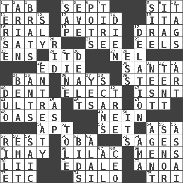 ACROSS 1. Keyboard key 4. Back-to-school mo. 8. Be seated 11. Blunders 13. Stay clear from 15. Call ___ day 16. Monetary unit of Yemen 17. _ dish (used to culture cells) 18. To draw with force 19. Letch 21. Perceive with the eye 22. Snakelike fish 23. Followers of ems 24. It would 27. Cartoonist voice _ Blanc 29. Singer Brickell 30. Before Barbara or Clara 34. Bar 36. Negative votes 39. Navigate 40. Scratch 41. Voters do this 43. Is not 44. Extremist 46. Russian ruler of old 47. Baseball player Mel 48. Fertile tracts in a desert 49. Count _ (2 wds.) 51. Fitting 53. Put into a specified state 54. White ___ sheet 57. Respite 60. Chief or king in Benin or Nigeria 63. Gurus 65. "If ____ say so..." 66. Pale purple color 69. Not women's 70. Cards in a Roman deck? 71. Peak District village in England 72. Small Philippine buffalo 73. And so on (abbr.) 74. Grain storage tower 75. Three (prefix) DOWN 1. Laconic 2. Believer in; advocate of (suffix) 3. Naughty children 4. Plant excrement 5. Night before a holiday 6. Plant holders 7. Become fatigued 8. Male parent of an animal 9. Slanted text style (abbr.) 10. Labels 12. Playfully artful 14. South Vietnam president (1954) 18. Conveyance 20. To free from 25. Prong on a fork 26. Started a card game 28. Double-curved letter 29. Plea 31. A home for chicks 32. Portable shelter 33. Tate display 34. Actor Lugosi 35. Pismires 37. It is so 38. Fraudulent business schemes 40. Superhero pair 42. Family _ (genealogy) 45. Cleo's killer 50. ___ a Wonderful Life 52. Lacquered or enameled metalware 54. Representative 55. Sir (Sp.) 56. Slender Brazilian palm 57. Cause heat under the collar 58. Give off 59. Ketch in the Levant 61. Auction offers 62. Jai ____ 64. Nanny (var.) 67. Everything 68. Corporate head (abbr.)