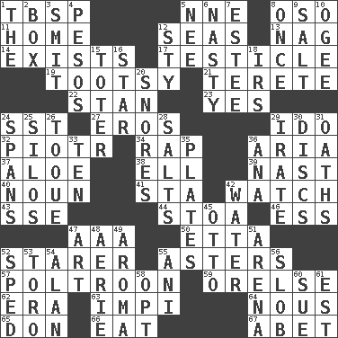 ACROSS 1. Cook's measure (abbr.) 5. Compass dir. 8. Bear (Spanish) 11. Dwelling 12. Oceans 13. Tired old horse 14. Is 17. A testis 19. A girl or young woman (variant) 21. Cigar-shaped 22. Comedian Laurel of Laurel & Hardy 23. Consenting reply 24. Fast jet (abbr.) 27. Greek god of love 29. Wedding promise 32. Peter (Polish) 34. Hit sharply and swiftly 36. Roberta Peters solo 37. Medicinal plant 38. Pipe bend 39. Political cartoonist Thomas 40. Part of speech 41. R.R. building 42. Timepiece 43. Compass dir. 44. Portico 46. Curvy letter 47. Auto club (abbr.) 50. Singer James 52. A viewer who gazes fixedly 55. Michaelmas daisies 57. Characterized by complete cowardliness 59. Threatening words 62. Period 63. Body of Kaffir warriors 64. Common sense 65. Spanish title 66. Ingest 67. Collude with DOWN 1. Definite Article 2. Gift holder 3. Stricken, poetically 4. Mexican monetary units 5. Born 6. Thoroughly unpleasant 7. First name in cosmetics 8. Single time 9. Table seasoning 10. Double curve, resembling the letter S 12. Filthy place 15. Carrier 16. Play the lead 18. Big collection agency 20. Sounds asleep 24. Connects, as a bridge 25. Grain storage towers 26. Woman's close-fitting hat 28. Table seasonings 29. Feeling or showing extreme anger 30. Plates 31. Expletives 33. "___ Little Indians" 35. Food holders 36. Santa ___, CA 42. Wetness 45. Von Bismarck 47. Nonscientific branch of learning 48. Nest on high 49. Odor 51. Sports stadium 52. Drove too fast 53. "Corrida" creature 54. ____ Jay Lerner 55. Cuckoo 56. Oscar Madison type 58. Elect 60. Take to court 61. Eastern Standard Time (abbr.)