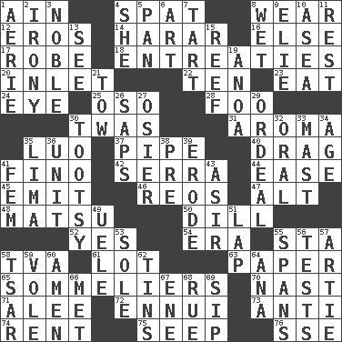 ACROSS 1. The 18th letter of the Arabic alphabet 4. Argument over a trivial matter 8. Erode 12. Greek god of love 14. Ethiopian city, capital of Harari 16. Otherwise 17. Loose flowing garment 18. Pleas 20. An arm off of a larger body of water 22. Nine, plus one 23. Ingest 24. Sight organ 25. Bear (Spanish) 28. Egg _ yung 30. It was, poetically 31. Scent 35. Nilotic language 37. Corncob 40. To draw with force 41. Fine (Spanish) 42. Father Junipero _ 44. Comfort 45. Send forth 46. Vintage cars 47. Keyboard modifier key 48. Taiwanese island in East China Sea 50. Deli pickle 52. It is so 54. Epoch 55. R.R. building 58. Federal power corp. 61. Car dealer's back yard 63. Some stationery 65. Wine waiters 70. Political cartoonist Thomas 71. Toward shelter 72. World-weariness 73. Opposed to 74. Monthly bill 75. Ooze 76. Compass dir. DOWN 1. Nest on high 2. Literary sarcasm 3. Impressive in appearance 4. A female animal or person 5. Baking dish 6. Tate display 7. Small pie 8. Soggy 9. Writer Wiesel 10. At sea 11. Respite 13. Perceive with the eye 15. Coral ridge 19. Small Philippine buffalo 21. Pull behind 26. Plant excrements 27. Flexible twig of a willow tree 29. Severe or trying experience 30. Tootsie (variant) 32. Spoken 33. Vertical spar for supporting sails 34. Ripen 35. Pale green bean 36. A single undivided whole 38. Before (prefix) 39. Eat (away) 41. Opposite of masc. 43. SW Saudi Arabia district 49. Ubangi River tributary 51. Pet locale 53. Flatfish 55. Connects, as a bridge 56. Trials 57. Nick name for Arthur 58. Russian ruler of old 59. Short-tailed, large-bodied rat 60. So be it 62. Canisters 64. Santa ___, CA 66. Was introduced to 67. Compass dir. 68. Regret 69. Small drink