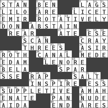ACROSS 1. Comedian Laurel of Laurel & Hardy 5. Benjamin's nick name 8. Falls behind 12. _ and Stitch 13. "We ___ not amused" (Victoria) 14. It is permitted: Lat. 15. Independent ruler or chieftain 16. Happening in regular succession 19. Spanish title 20. Refrain by choice 21. Rump 23. Had dinner 24. Compass dir. 27. Skim 30. Supercomputer manufacturer 31. Threesomes 34. SW Saudi Arabia district 35. Writer of Portnoy's Complaint (1969) 38. Lessep's creation 40. Ancient Persian 41. Dutch treat 42. Poe poem 44. Actor Lugosi 45. Coast Guard woman 46. Compass dir. 47. Reproach for some lapse or misdeed 50. Table seasoning 53. Stimulate to action 57. Double-curved letter 59. Supplying deficiencies 63. Nursemaid 64. Maternal 65. Baking dish 66. Unadorned 67. Opera by Verdi 68. Conclusion 69. Ancient Greek god of war DOWN 1. Downhill vehicle 2. Southeast Indonesia island 3. Place in a line 4. Not either 5. Sharp remark 6. Greek god of love 7. Remaining after all deductions 8. 54 in ancient Rome 9. Adept person 10. Set 11. Filthy place 14. Actor's bit 17. American Automobile Association (abbr.) 18. Teat (slang) 20. Bowlike part 22. Respiratory problem 24. Celtic language 25. Stated 26. Jane of fiction 28. Curve 29. Actress Patricia 30. Device for capturing images 32. Compass dir. 33. Without 35. Confederate soldiers (slang) 36. Lyric poems 37. Story 39. Trim (branches) 43. Raze (variant) 47. Cause heat under the collar 48. A saturated hydrocarbon 49. Pacific Standard Time (abbr.) 51. Arboreal primate 52. Sadhe (variant) 54. Corncob 55. "Terrible" tsar 56. Tear apart 58. "______ My Girl" (Turtles hit) 59. Ocean 60. Single; one (prefix) 61. Groovy apt. 62. Parent Teacher Assoc. 63. Santa ___, CA