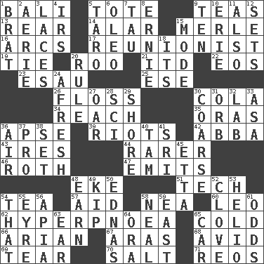 ACROSS 1. Indonesian resort city 5. Haul 9. Beverages made from leaves 13. Located in or toward the back 14. Having or resembling wings 15. Haggard of country music 16. Arches 17. One who advocates reunion 19. Neckwear 20. Friend of Pooh 21. It would 22. Greek goddess of the dawn 23. Son of Isaac 25. Compass dir. 26. Soft thread for cleaning between teeth 30. Root beer relative 34. Arrive at 35. Mouths or openings 36. Domed church section 39. Disturbances 42. Swedish rock group 43. Angers 44. More valued for its uncommonness 46. Writer of Portnoy's Complaint (1969) 47. Gives off 48. Supplement with great effort 51. Technician 54. Afternoon social gathering 57. Assist 58. Teachers' org. 60. Lion 62. Abnormally rapid or deep breathing 65. Chilled 66. Believer in; advocate of (suffix) 67. Caspian sea tributary 68. Enthusiastic 69. Lacerate 70. Table seasoning 71. Vintage cars DOWN 1. Naughty child 2. Nest on high 3. Shoestrings 4. Big collection agency 5. Edible starchy tuberous root 6. Margarine 7. The 19th letter of the Greek alphabet 8. Bert's buddy 9. "___ Little Indians" 10. One of the Great Lakes 11. In addition 12. Arranges properly for use 15. Method 18. ___ a Wonderful Life 20. Governing power 24. Anew 27. Rowing implement 28. _-fi 29. Dinah or Pauly 30. Rough 31. Globe 32. Experiment locale 33. White ___ sheet 36. Atmosphere 37. Adept person 38. Arrange properly for use 40. Scottish cap 41. _ Lanka 45. Singer James 48. Merit 49. Sleep 50. Ferber et al. 52. Garlic unit 53. Sun: prefix 54. Not this but _ 55. Jane of fiction 56. Capital of Western Samoa 58. Be tempered by heat 59. Compass direction 61. Probability 63. Ewer handle 64. Mouth or opening 65. 4-wheeled motor vehicle