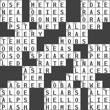 ACROSS 1. Order of Saint Francis (abbr.) 4. Distance measurement (Brit.) 9. Singer Brickell 13. Teachers' org. 14. Off-Broadway awards 15. To erase 16. Snakelike fish 17. Child's nurse 18. Northwest Algerian city 19. Pacific Standard Time (abbr.) 21. Fish or hair follower 22. Tree or shrub in the Birch family 24. Suggestive of the supernatural 26. Actress Charlotte 27. Giggle 29. Disorderly crowds 30. U. of Maine site 31. Oceans 33. _ Lanka 36. Bear (Spanish) 37. Orator 40. For each 41. Directed 42. Pace 43. Lacking in sense or substance 45. SW Saudi Arabia district 47. Shoestrings 48. Opposite of masc. 49. False hair 50. Match 52. Chief or king in Benin or Nigeria 54. She-sheep 56. A type of plum 57. Broad, flat, thick pieces 59. The first octave above the treble staff 61. High mountains 62. Phone greeting 63. Falsehood 64. Romantic infatuation 65. Residences 66. Dry husk or covering DOWN 1. Single 2. Ooze 3. It jiggles the polygraph 4. Crowd into 5. Dark wood 6. Prong on a fork 7. Monthly bill 8. Compass dir. 9. Eats (away) 10. Have the gumption 11. Austrian river, tributary to the Danube 12. Car or cant ending 20. Adolescent 22. Came up 23. Experiment locale 25. Vintage cars 27. Instrument 28. Celtic language 29. Cause to be 31. Scorch 32. Erode 33. High altitude stroll 34. French philosopher Descartes 35. Angers 38. A-one 39. Cause heat under the collar 44. Nathan's nickname 45. Anew 46. Perceive with the eye 49. Eating place 50. Silent film actress Nazimova 51. Republicans 52. Margarine 53. Lip ointment 55. Writer Wiesel 56. Plant excrement 57. Quiet! 58. Mayday 60. John Ritter's dad