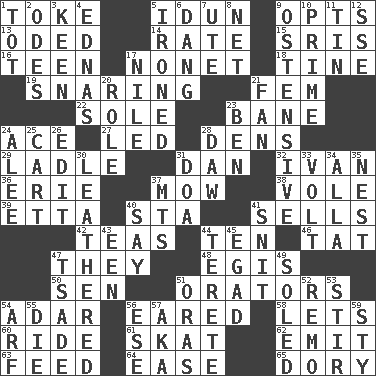 ACROSS 1. Casino tip 5. Goddess of spring and wife of Bragi 9. Chooses 13. Wrote a lyric poem 14. Pace 15. Indian titles of respect 16. Adolescent 17. Music written for nine 18. Prong on a fork 19. Catching in a trap 21. Opposite of masc. 22. Not divided or shared with others 23. Object of repulsion 24. Adept person 27. Directed 28. Hiding places for outlaws 29. Dipping utensil 31. One of the 12 tribes of Israel 32. _ the terrible 36. 4th largest of the Great Lakes 37. Cut the grass 38. Grand slam 39. Singer James 40. R.R. building 41. Exchanges for money 42. Afternoon social gatherings 44. "___ Little Indians" 46. Make lace 47. Those people 48. Armor plate that protects the chest 50. Elected rep. 51. Speakers 54. The sixth month of the Jewish calendar 56. Having ears or earlike features 58. Allows 60. Travel on or in a vehicle 61. Three-handed card game 62. Send forth 63. Nourish 64. Comfort 65. Dinghy DOWN 1. Small child 2. Lyric poems 3. Peachy ____! 4. Ferber et al. 5. Pressed 6. Mild oath, euphamism for damn 7. Shoshoni 8. Fish or hair follower 9. Clearly or manifestly demonstrative 10. First class 11. Shallow baking pan 12. Compass dir. 17. Mediterranean tributary 20. Hero or heavy, e.g. 21. Air blower 23. Benjamin's nick name 24. Toward shelter 25. Heavy open wagon 26. Prepare for publication 28. Fool 30. Tough but pliablecoriaceous 31. ___ good deed 33. Electrical Unit 34. Silent film actress Nazimova 35. Egg locale 37. Mountains (abbr.) 40. Declare 41. In a ____ (agitated or irritated) 43. Car or cant ending 44. Cylindrical with tapered ends 45. Mild oath 47. Sadhe (variant) 49. Having a sole or soles 51. Mouths or openings 52. San ____ (Riviera town) 53. Commotion 54. Sandy's bark 55. Expire 56. Compass dir. 57. Alias (abbr.) 59. Filthy place