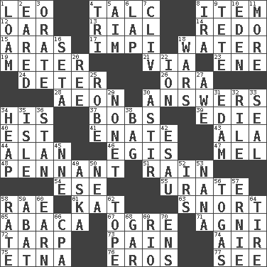ACROSS 1. Lion 4. Baby powder 8. A whole individual unit 12. Boat paddle 13. Monetary unit of Yemen 14. Redecorate 15. Caspian sea tributary 17. Body of Kaffir warriors 18. Wetness 19. Distance measurement 21. By way of 23. Compass dir. 24. Prevent from occurring 26. Mouth or opening 28. Age 30. Responds (to) 34. Part of HMS, perhaps 37. Moves up and down 39. Singer Brickell 40. Eastern Standard Time (abbr.) 41. Maternal 43. According to 44. ____ Jay Lerner 46. The front part of a cuirass 47. Cartoonist voice _ Blanc 48. Pre-World Series prize 51. Precipitation 54. Compass dir. 55. A salt of uric acid 58. Actress Charlotte 61. Krazy ___ of comics 63. Derisive sound 65. Phillipine bananalike plant 67. Legendary monster 71. Hindu god of fire 72. Canvas cover 73. Ache 74. Wind 75. Inactive volcano in Sicily 76. Greek god of love 77. Perceive with the eye DOWN 1. Rich soil 2. Having ears or earlike features 3. Speak pompously 4. Three (prefix) 5. Direct toward a target or goal 6. Pet locale 7. 154 in Roman numerals 8. Lyricist Gershwin 9. False hair 10. Genesis locale 11. Greater amount 16. Stalk of a moss capsule 18. Armed conflicts 20. To riddle 22. Electrically charged atom 25. Loose flowing garment 27. Deep reverence 29. Music written for nine 30. Moving about 31. Dutch treat 32. Cause heat under the collar 33. Lick closed 34. Pile 35. Capri or Wright 36. Comedian Laurel of Laurel & Hardy 38. Container for groceries 42. Son of Isaac 45. Compass dir. 49. "____ silly question..." 50. Teachers' org. 52. Big collection agency 53. Nanny 56. Ancient Roman robes 57. Bert's buddy 58. Assign a rank or rating to 59. Blind as ____ 60. Merit 62. Drink excessively 64. Hoop that covers a wheel 66. Numbers guy (abbr.) 68. Slender fish 69. _ de Janeiro 70. Followers of ems