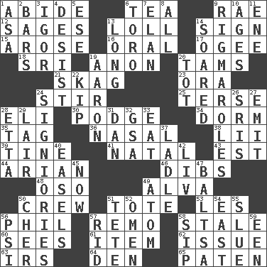 ACROSS 1. Tolerate 6. Beverage made from leaves 9. Actress Charlotte 12. Gurus 13. Hang loosely or laxly 14. Omen 15. Came up 16. Of the mouth 17. Double curve, resembling the letter S 18. Indian title of respect (Mr.) 19. At once, immediately (arch.) 20. Scottish caps 21. Heroin 23. Mouth or opening 24. Commotion 25. Laconic 28. Connecticut Ivy Leaguer 30. Plash 34. Dormintory (informal) 35. Label 36. Rhinal 38. Cards in a Roman deck? 39. Prong on a fork 41. Brizilian seaport 43. Eastern Standard Time (abbr.) 44. Believer in; advocate of (suffix) 46. Rights 48. Bear (Spanish) 49. Inventor's middle name 50. Group working together 51. Haul 53. French article 56. Silvers or Donahue 57. San ____ (Riviera town) 58. Having lost freshness 60. Observes 61. A whole individual unit 62. Come out of 63. Big collection agency 64. Lair 65. Eucharist need DOWN 1. White ___ sheet 2. Oblong pieces of solid material 3. Russian composer Stravinsky 4. Stop 5. Compass dir. 6. "Corrida" creature 7. Enthusiasm 8. Everything 9. Frustrating wastes of time 10. Matures 11. Compass dir. 13. Having great length 14. Flew 19. Composer Copland 20. Small child 22. Monetary unit of Laos 24. Seigniories (variant) 26. Indian titles of respect 27. Give off 28. Singer James 29. Den 31. Daniel's nick name 32. Girls' org. (abbr.) 33. Consume 37. Dipping utensil 40. Artist's stands 42. 54 in ancient Rome 45. Immediately 47. Greek mezzo-soprano Agnes 49. Tiny particle 50. "Mermaids" star 51. Wig 52. Presage 54. Compass direction 55. Turn sharply 56. Air pressure measure (abbr.) 57. To free from 58. Small drink 59. Car or cant ending