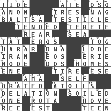 ACROSS 1. Event that recurs at intervals 5. Had dinner 8. Bear (Spanish) 11. At once, immediately (arch.) 12. Angers 13. Tired old horse 14. Greek mezzo-soprano Agnes 17. One of the two male reproductive glands 19. Looked after 21. Cigar-shaped 22. Stern 23. Ocean 24. Make lace 27. Greek god of love 29. Coat; cloak 32. Ethiopian city, capital of Harari 34. Heredity factor (abbr.) 36. Ear part 37. SW Asia republic 38. Greek goddess of the dawn 39. 4th largest of the Great Lakes 40. Connecting point 41. Two (Sp.) 42. Residences 43. Compass dir. 44. Hoop that covers a wheel 46. Compass dir. 47. Nanny (var.) 50. Oneself 52. Spoke pompously 55. Ringlike coral islands and reefs 57. Accusation by an informer 59. Dirtied 62. Single 63. Roll call or roster of names 64. Be footloose 65. To sift 66. Eastern Standard Time (abbr.) 67. Adolescent DOWN 1. Bar bill 2. _ tizzy (2 wds.) 3. Stupid person 4. Keyboard key 5. "We ___ not amused" (Victoria) 6. Trials 7. First name in cosmetics 8. At one time in the past 9. Table seasoning 10. Double curve, resembling the letter S 12. It would 15. Contemptuous expression 16. The sixth month of the Jewish calendar 18. Lyricist Gershwin 20. Eaten away 24. One or ones belonging to thee 25. Composer Copland 26. Swap 28. Snout, nose 29. Singer Mel 30. Off-Broadway awards 31. Honkers 33. One (Scot) 35. Aid 36. Lion 42. Phone greeting 45. Vintage cars 47. _ moment's notice (2 wds.) 48. Distance measurement (Brit.) 49. Goodbye (Sp.) 51. Talk or behave amorously 52. Aroma 53. French philosopher Descartes 54. Toward shelter 55. Santa ___, CA 56. A type of plum 58. Baseball player Mel 60. First lady 61. Lair