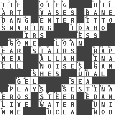 ACROSS 1. Standoff 4. Cassini of fashion 8. Petroleum 11. Tate display 12. Flower holders 14. Object of repulsion 15. Mild oath, euphamism for damn 17. Keyboard key 18. "Tell ____ the Marines!" 19. Catching in a trap 21. Potato state 23. Big collection agency 24. Double-curved letter 25. Went 27. Grant temporary use of 30. Ewer handle 31. Flight of steps 34. Hit sharply and swiftly 37. Teachers' org. 38. Assad's deity 39. _ tizzy (2 wds.) 40. Pipe bend 41. Annoying sounds 43. Separate the seeds from cotton 44. "______ My Girl" (Turtles hit) 45. Mountain range 47. Set 49. Ocean 50. Romps 52. French poetic form 56. Greek god of love 57. Guide 60. Dutch treat 61. Not recorded 62. Wetness 63. Single; one (prefix) 64. Madame (abbr.) 65. Southern CA. univ. 66. Lower and raise head in agreement DOWN 1. Small boys 2. SW Asia republic 3. Inactive volcano in Sicily 4. Baking chambers 5. Long (Scottish) 6. Eastern Standard Time (abbr.) 7. Turn to the right 8. Curses 9. To the inside or interior of 10. Lion 13. _ Lanka 14. Prejudice 16. Broad smile 20. Angers 22. Lair 25. Highlander 26. Spoken 27. Ms. Damita and namesakes 28. Mouths or openings 29. American tennis player Robert 30. Compass dir. 32. Hyperbolic tangent 33. Medicinal plant 34. Capital of Latvia 35. Of or related to the anus 36. Baking dish 42. Takes to court 44. Cunning 46. Assign a rank or rating to 47. Michael Jackson trademark 48. Relaxation 49. Father Junipero _ 50. Demure 51. Compass dir. 52. Sew up the eyelids of hawks and falcons 53. Goddess of spring and wife of Bragi 54. Billionth: prefix 55. Among 56. Shade tree 58. The 19th letter of the Greek alphabet 59. And so on (abbr.)