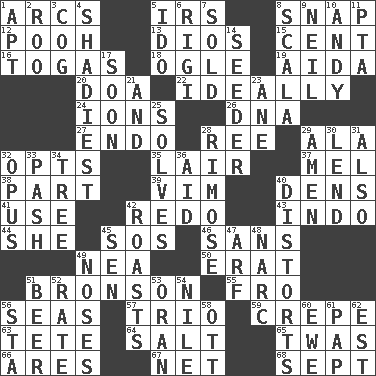 ACROSS 1. Arches 5. Big collection agency 8. Fastener 12. "Silly old bear" 13. "Vaya con ____" 15. Penny 16. Ancient Roman robes 18. Stare 19. Opera by Verdi 20. ___ good deed 22. Under perfect conditions 24. Charged particles 26. Heredity factor (abbr.) 27. Inside; within (prefix) 28. Portuguese money of account (variant) 29. Insect wing 32. Chooses 35. Den 37. Cartoonist voice _ Blanc 38. Role in a play 39. Zeal 40. Habitations of wild animals 41. Purpose 42. Do over again 43. Southeast Asian peninsula 44. A female animal or person 45. Distress signal 46. Without 49. Teachers' org. 50. Part of Q.E.F. 51. "Death Wish" actor 55. Away 56. Oceans 57. Musical group of three 59. Streamer paper 63. Wig 64. Table seasoning 65. It was, poetically 66. Ancient Greek god of war 67. Fish or hair follower 68. Back-to-school mo. DOWN 1. Fitting 2. Friend of Pooh 3. Gear tooth 4. Most dubious of character or honesty 5. Wedding promise 6. Swiss mountan, "Queen of the Mountains" 7. Disposed of to a purchaser 8. Any of the three canals of the cochlea 9. Famous astronaut Armstrong 10. "60 Minutes" Commentator Rooney 11. Parent Teacher Association (abbr.) 14. Sowing specialist 17. Within a short period 21. Added to 23. One (Scot) 25. Finds the solution 28. Full of chinks, cracks, or crevices 29. So be it 30. Grant temporary use of 31. In addition 32. Musical composition 33. Romantic infatuation 34. Relationship diagram 36. Assist 40. What propaganda does 42. Exposes to great heat 45. Elected rep. 47. Sandy's bark 48. Drug cop 49. Olfactory organs 51. Fermented drink made from hops 52. Assign a rank or rating to 53. NW Algerian seaport 54. The longest river in the world 56. R.R. building 58. Baseball player Mel 60. She-sheep 61. Infant food 62. Eastern Standard Time (abbr.)