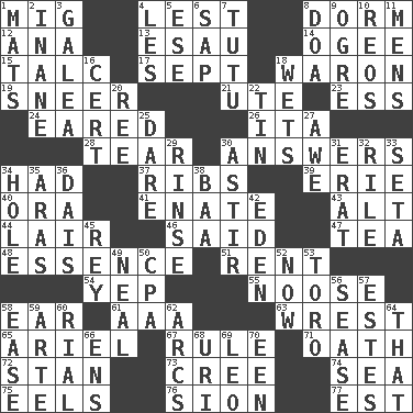 ACROSS 1. Russian fighter aircraft 4. For fear that 8. Dormintory (informal) 12. Santa ___, CA 13. Son of Isaac 14. Double curve, resembling the letter S 15. Baby powder 17. Back-to-school mo. 18. Make _____ (do battle with) 19. Scornful expression 21. Shoshoni 23. Double-curved letter 24. Having ears or earlike features 26. Call ___ day 28. Pull into pieces 30. Replies (to) 34. Possessed 37. Chest bones 39. One of the Great Lakes 40. Mouth or opening 41. Maternal 43. Keyboard modifier key 44. Den 46. Expressed in words 47. Afternoon social gathering 48. Center 51. Monthly bill 54. Slangy assent 55. Trap for birds or small mammals 58. Ewer handle 61. Auto club (abbr.) 63. Take or capture by force 65. Satellite of Uranus 67. Court order 71. Pledge 72. Comedian Laurel of Laurel & Hardy 73. Algonquian 74. Ocean 75. Snakelike fish 76. The Jewish people; Israel 77. Eastern Standard Time (abbr.) DOWN 1. Floor coverings 2. Empty; void 3. An organ shaped like a helmet 4. French article 5. Compass dir. 6. Plant excrement 7. Ballerina skirt 8. ___ good deed 9. Legendary monster 10. Vintage cars 11. Not women's 16. Certainty 18. Moistens 20. To separate or throw off 22. Shallow baking pan 25. Have the gumption 27. Deep reverence 29. Remove soap 30. Being in motion 31. Part of Q.E.F. 32. Cause heat under the collar 33. Stalk of a moss capsule 34. Hollow 35. Ancient river in northeast Turkey 36. Raised platform 38. Sound made by sheep 42. Paradise 45. Marina Del _, California 49. Actress Patricia 50. Tax preparer (abbr.) 52. At this time 53. "Corrida" creature 56. Gospel singer Marvin 57. _____ Park, CO 58. Relaxation 59. Johnson of "Laugh-In" 60. Monetary unit of Yemen 62. Arches 64. Not this but _ 66. Followers of ems 68. RI univ. 69. Lion 70. Car or cant ending