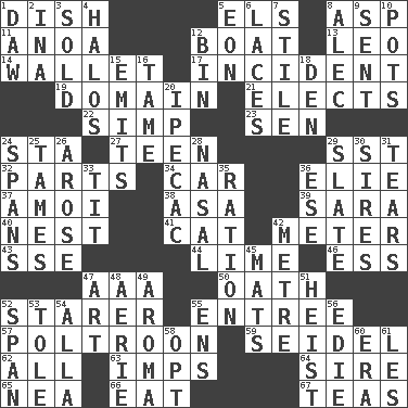 ACROSS 1. Food container 5. Raised railways 8. Cleo's killer 11. Small Philippine buffalo 12. Water vessel 13. Lion 14. Place for singles 17. Event 19. Kingdom 21. Opts 22. Simple or foolish person 23. Elected rep. 24. R.R. building 27. Adolescent 29. Fast jet (abbr.) 32. Actors' quests 34. Auto 36. Writer Wiesel 37. Mine, in Marseilles 38. White ___ sheet 39. "Two Mules for Sister ____" 40. Egg locale 41. Feline 42. Distance measurement 43. Compass dir. 44. Welles in "The Third Man" 46. Double-curved letter 47. Auto club (abbr.) 50. Pledge 52. A viewer who gazes fixedly 55. Main course 57. Characterized by complete cowardliness 59. A glass for beer 62. 100% 63. Naughty children 64. The founder of a family 65. Teachers' org. 66. Consume 67. Afternoon social gatherings DOWN 1. Simpleton 2. _ tizzy (2 wds.) 3. Exchanged or delivered for money 4. Auras 5. Age 6. Shoestrings 7. Vertical member of a panel or frame 8. Actor Baldwin 9. Transmitted 10. Plant holders 12. Storage container 15. Sends forth 16. Not wild 18. Lair 20. Medicinal drug used to evoke vomiting 24. Connects, as a bridge 25. Softens 26. Came up 28. Rhinal 29. Chalkboard 30. Begets 31. Lacerates 33. Teat (slang) 35. Food allowance for one day 36. Compass dir. 42. Distance measurement (Brit.) 45. Floor coverings 47. Nonscientific branch of learning 48. Nest on high 49. Scent 51. Robbery 52. Connect, as a bridge 53. Lacquered or enameled metalware 54. Silent film actress Nazimova 55. Followers of ems 56. Singer Brickell 58. Choose 60. Period 61. French article