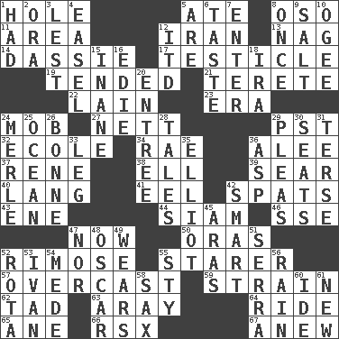 ACROSS 1. Opening into or through something 5. Had dinner 8. Bear (Spanish) 11. Length times width 12. SW Asia republic 13. Tired old horse 14. Hyrax 17. A testis 19. Watched over 21. Cylindrical with tapered ends 22. (Had) reclined 23. Epoch 24. Crowd into 27. Remaining after all deductions 29. Pacific Standard Time (abbr.) 32. Learning spot: Fr. 34. Actress Charlotte 36. Toward shelter 37. French philosopher Descartes 38. Pipe bend 39. Singe 40. Long (Scottish) 41. Snakelike fish 42. Arguments over trivial matters 43. Compass dir. 44. Thailand, formerly 46. Compass dir. 47. At this time 50. Mouths or openings 52. Full of chinks, cracks, or crevices 55. A viewer who gazes fixedly 57. Cloudy 59. Put through a sieve 62. Bit 63. Like ___ of sunshine 64. Travel on an animal 65. One (Scot) 66. Acura sports coupe 67. Afresh DOWN 1. Possessed 2. Mouth or opening 3. For fear that 4. Artist's stand 5. "We ___ not amused" (Victoria) 6. Clothes sense 7. Keyboard key 8. At one time in the past 9. Table seasoning 10. Double curve, resembling the letter S 12. It would 15. Empty; void 16. Singer Brickell 18. Lyricist Gershwin 20. Main course 24. Haggard of country music 25. Sea 26. Child's nurse 28. Falsehoods 29. Entreaties 30. Theater features 31. Laconic 33. Part of a journey 35. American author Paul (1891-1958) 36. Cleo's killer 42. Don Adams' spy role 45. Ancient river in northeast Turkey 47. Not either 48. Witty Wilde 49. Erodes 51. Father Junipero _ 52. Round or rotation of duties 53. _ the terrible 54. Ancient Persian 55. Filthy place 56. Precipitation 58. Saxophone 60. Binary compound 61. ___ Haven, CT