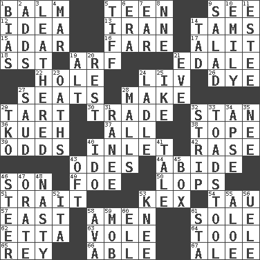 ACROSS 1. Lip ointment 5. Adolescent 9. Perceive with the eye 12. It may be bright or harebrained 13. SW Asia republic 14. Scottish caps 15. The sixth month of the Jewish calendar 16. Conductor's collection 17. Set down 18. Fast jet (abbr.) 19. Sandy's bark 21. Peak District village in England 22. Hollow 24. 54 in ancient Rome 26. Color 27. Theater features 28. Cause to be 29. Small pie 30. Barter 32. Comedian Laurel of Laurel & Hardy 36. Malaysian steamed pastry 37. 100% 38. Drink excessively 39. Probability 40. An arm off of a larger body of water 42. Raze (variant) 43. Lyric poems 44. Stay 46. Male offspring 49. Enemy 50. Chops off 51. Distinguishing feature 53. Dry husk or covering 54. The 19th letter of the Greek alphabet 57. 90 degrees 58. So be it 61. Flatfish 62. Singer James 63. Grand slam 64. Implement 65. Marina Del _, California 66. Competent 67. Toward shelter DOWN 1. Prejudice 2. Does sums 3. Tough but pliablecoriaceous 4. Spoil 5. Small quarrel 6. Period 7. Ewer handle 8. Compass dir. 9. Vegetable dish 10. Poet Dickinson 11. First name in cosmetics 14. Small amount or degree 19. The first octave above the treble staff 20. Take ten 21. Night before a holiday 23. Profane or obscene expressions 24. Dipping utensil 25. Eisenhower's nickname 27. Saudi Arabian king (1953-1964) 28. Promenades 29. Ring climax 31. Indian princess (variant) 32. Long narrow piece of something 33. Inedible or poisonous agaric 34. Domed church section 35. Born 40. Wedding promise 41. Story 43. Often (poetically) 45. Gift holder 46. Navigate 47. Speak pompously 48. Difficult 52. Call ___ day 53. Leg joint 55. _ vera 56. Ubangi River tributary 58. Actress Gardner 59. Disorderly crowd 60. Pipe bend 61. R.R. building
