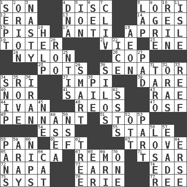 ACROSS 1. Boy, to dad 4. Compact _ 8. Australian parrot (variant) 12. Epoch 13. Christmas carol 14. Ripens 15. Expression of disdain 17. Opposed to 18. Showery time 19. Carrier 21. Compete 23. Compass dir. 24. High-strength synthetic material 26. Police officer (slang) 28. Cooking vessels 30. Legislator 34. Indian title of respect (Mr.) 37. Body of Kaffir warriors 39. Have the gumption 40. And not 41. Travel by water 43. Actress Charlotte 44. "Terrible" tsar 46. Vintage cars 47. Order of Saint Francis (abbr.) 48. Pre-World Series prize 51. Close up, plug up 54. Curvy letter 55. Showing deterioration from age 58. Baking dish 61. Newt 63. Collection of objects 65. N. Chile seaport 67. San ____ (Riviera town) 71. Russian ruler of old 72. California wine valley 73. Merit 74. Begley and Asner 75. System (abbr.) 76. 4th largest of the Great Lakes 77. To sift DOWN 1. Back-to-school mo. 2. Greek mythologigal hunter 3. Smutty 4. Heredity factor (abbr.) 5. Electrically charged atom 6. Arrange properly for use 7. 154 in Roman numerals 8. Pet locale 9. Legendary monster 10. It's straight from the horse's mouth 11. Small island 16. Assist 18. Period of immesurable duration 20. Friend of Pooh 22. Frozen water 25. Nuclear Threat Initiatives 27. Writing tablet 29. Don Adams' spy role 30. Grain storage towers 31. Pacific island yam 32. Mouths or openings 33. Coral collection 34. Sever or remove by pinching or nipping 35. Be footloose 36. SW Asia republic 38. Sliced dessert 42. Fast planes 45. Compass dir. 49. At sea 50. Overdraft (abbr.) 52. Baseball player Mel 53. Role in a play 56. Failure 57. Elude 58. Baking dishes 59. Like ___ of sunshine 60. Cuts off 62. Relationship diagram 64. Celtic language 66. Feline 68. Hearing organ 69. Medical imaging device (abbr.) 70. Single